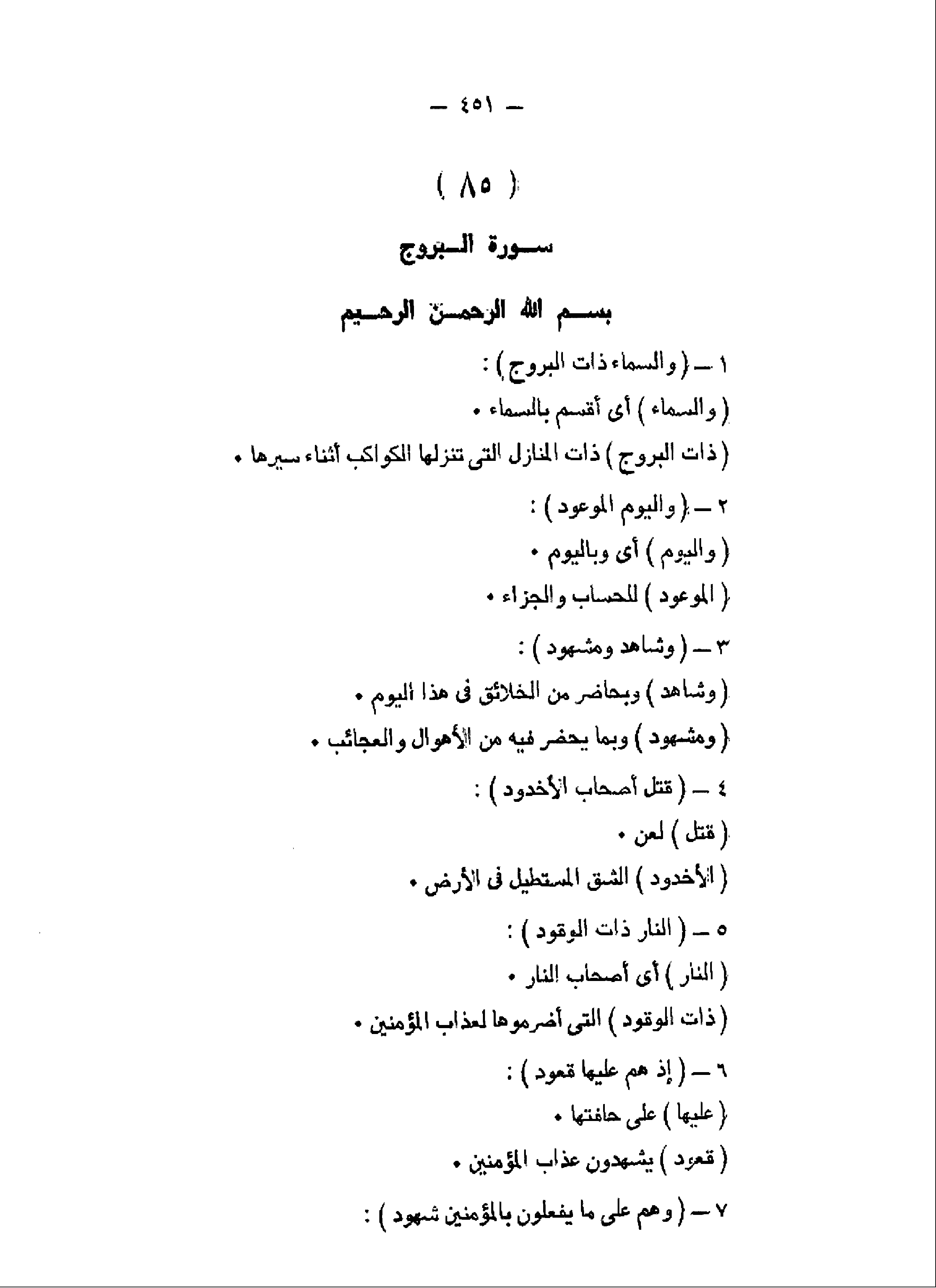 وَالسَّماءِ ذاتِ الْبُرُوجِ (1) وَالْيَوْمِ الْمَوْعُودِ (2) وَشاهِدٍ وَمَشْهُودٍ (3) قُتِلَ أَصْحابُ الْأُخْدُودِ (4)