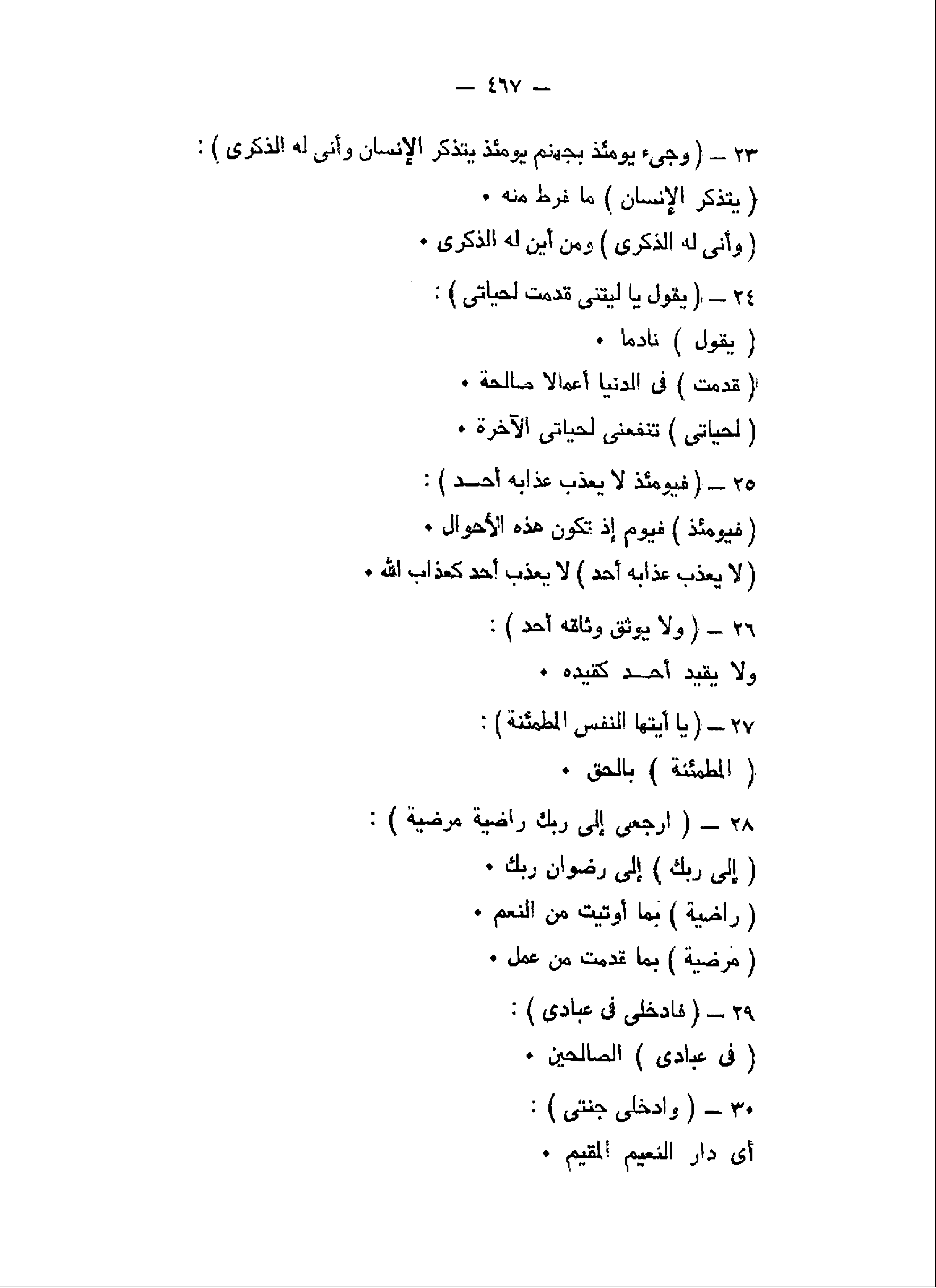 وَجِيءَ يَوْمَئِذٍ بِجَهَنَّمَ يَوْمَئِذٍ يَتَذَكَّرُ الْإِنْسانُ وَأَنَّى لَهُ الذِّكْرى (23) يَقُولُ يا لَيْتَنِي قَدَّمْتُ لِحَياتِي (24) فَيَوْمَئِذٍ لا يُعَذِّبُ عَذابَهُ أَحَدٌ (25) وَلا يُوثِقُ وَثاقَهُ أَحَدٌ (26) يا أَيَّتُهَا النَّفْسُ الْمُطْمَئِنَّةُ (27)
