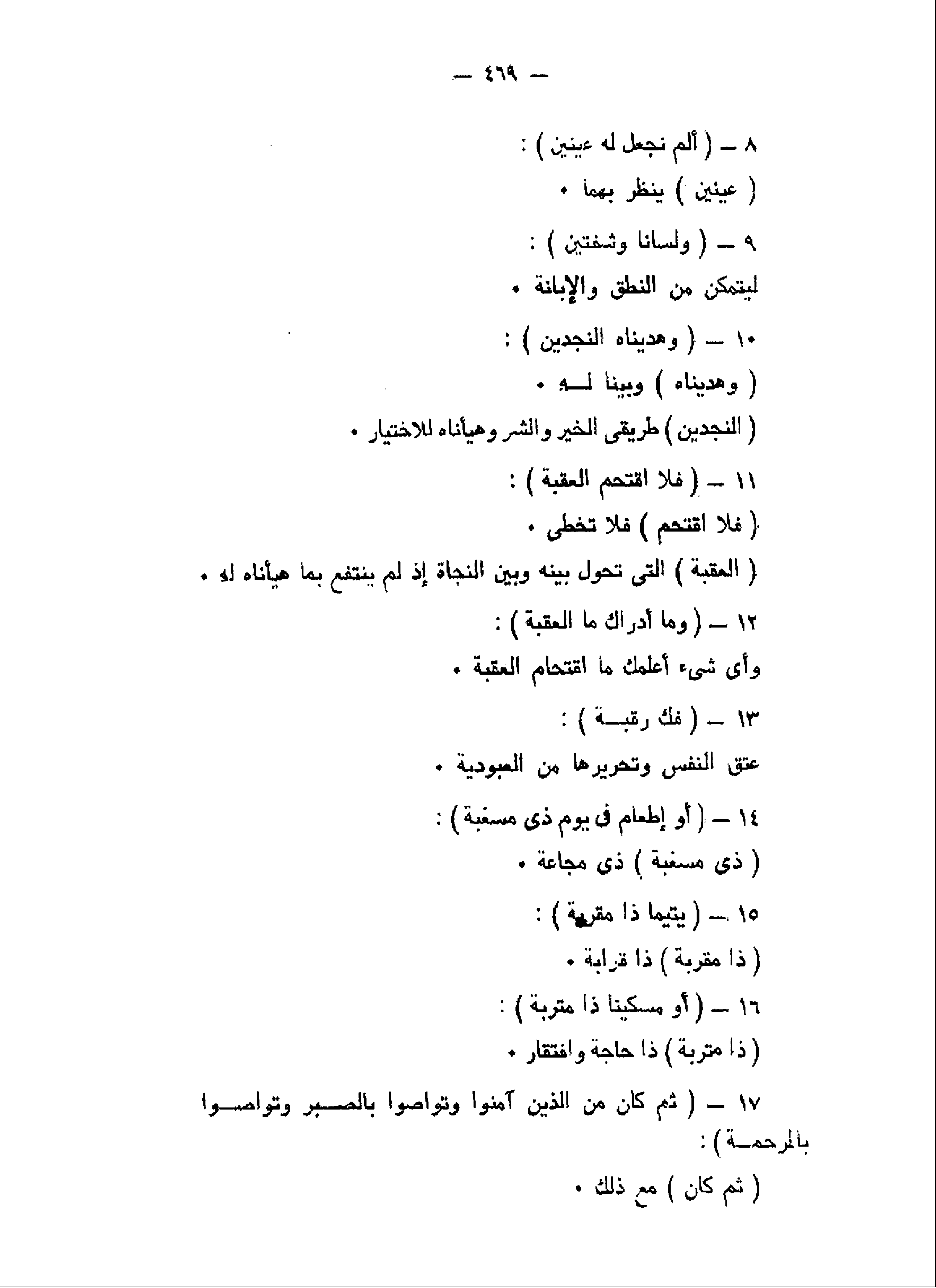 وَهَدَيْناهُ النَّجْدَيْنِ (10) فَلا اقْتَحَمَ الْعَقَبَةَ (11) وَما أَدْراكَ مَا الْعَقَبَةُ (12) فَكُّ رَقَبَةٍ (13) أَوْ إِطْعامٌ فِي يَوْمٍ ذِي مَسْغَبَةٍ (14)