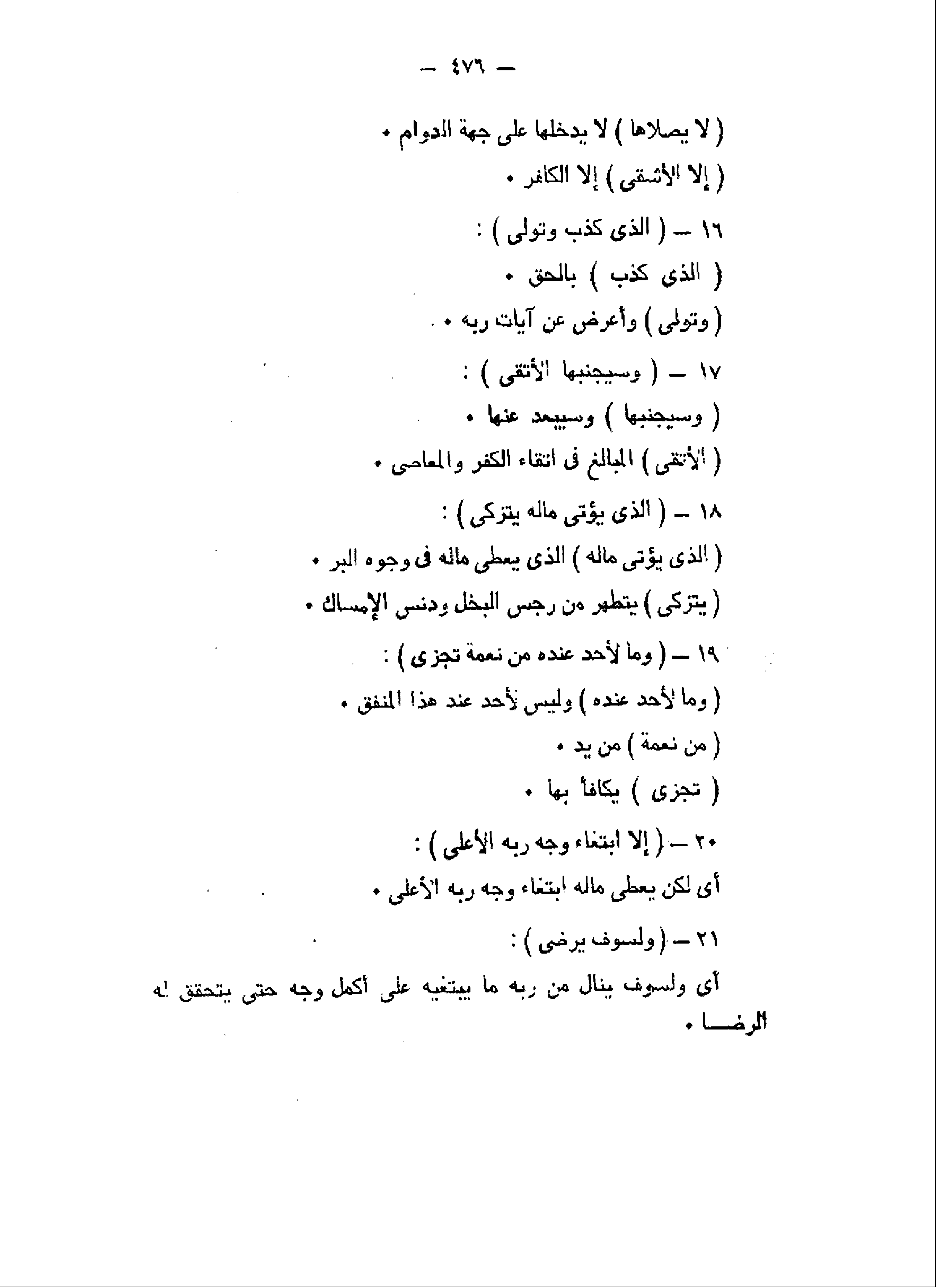 الَّذِي كَذَّبَ وَتَوَلَّى (16) وَسَيُجَنَّبُهَا الْأَتْقَى (17) الَّذِي يُؤْتِي مالَهُ يَتَزَكَّى (18) وَما لِأَحَدٍ عِنْدَهُ مِنْ نِعْمَةٍ تُجْزى (19) إِلاَّ ابْتِغاءَ وَجْهِ رَبِّهِ الْأَعْلى (20)