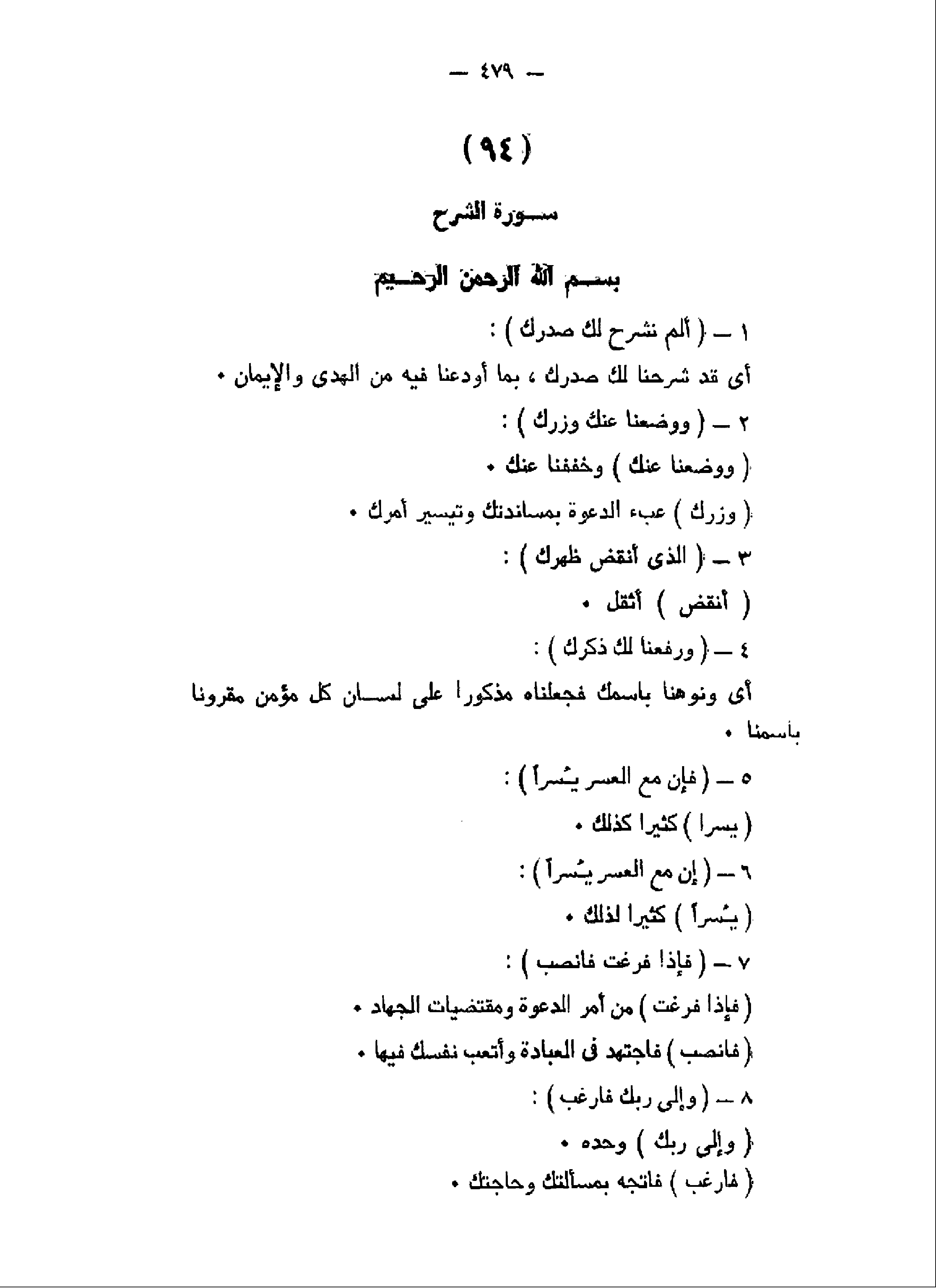 أَلَمْ نَشْرَحْ لَكَ صَدْرَكَ (1) وَوَضَعْنا عَنْكَ وِزْرَكَ (2) الَّذِي أَنْقَضَ ظَهْرَكَ (3) وَرَفَعْنا لَكَ ذِكْرَكَ (4)