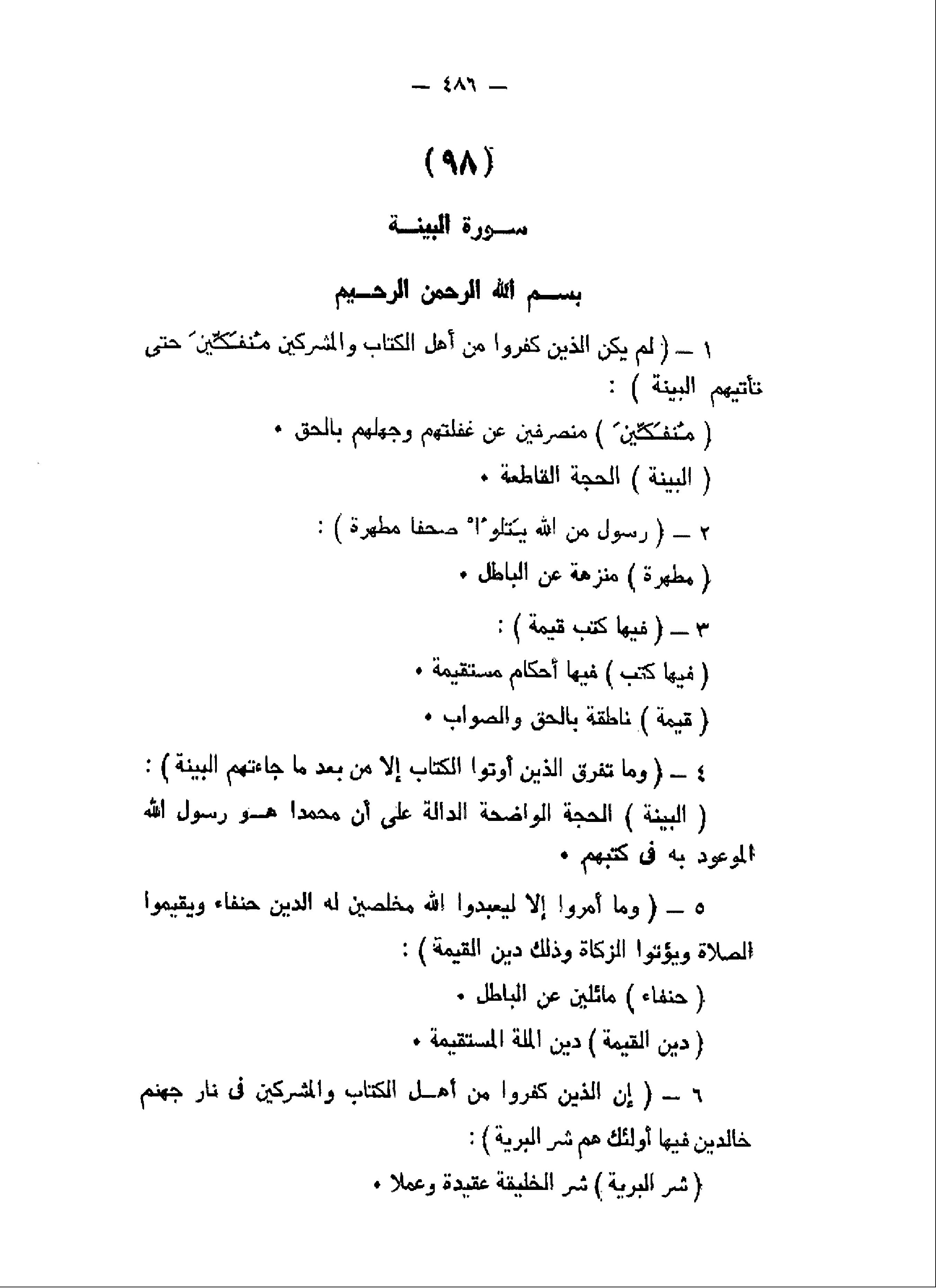 لَمْ يَكُنِ الَّذِينَ كَفَرُوا مِنْ أَهْلِ الْكِتابِ وَالْمُشْرِكِينَ مُنْفَكِّينَ حَتَّى تَأْتِيَهُمُ الْبَيِّنَةُ (1) رَسُولٌ مِنَ اللَّهِ يَتْلُوا صُحُفاً مُطَهَّرَةً (2) فِيها كُتُبٌ قَيِّمَةٌ (3) وَما تَفَرَّقَ الَّذِينَ أُوتُوا الْكِتابَ إِلاَّ مِنْ بَعْدِ ما جاءَتْهُمُ الْبَيِّنَةُ (4)