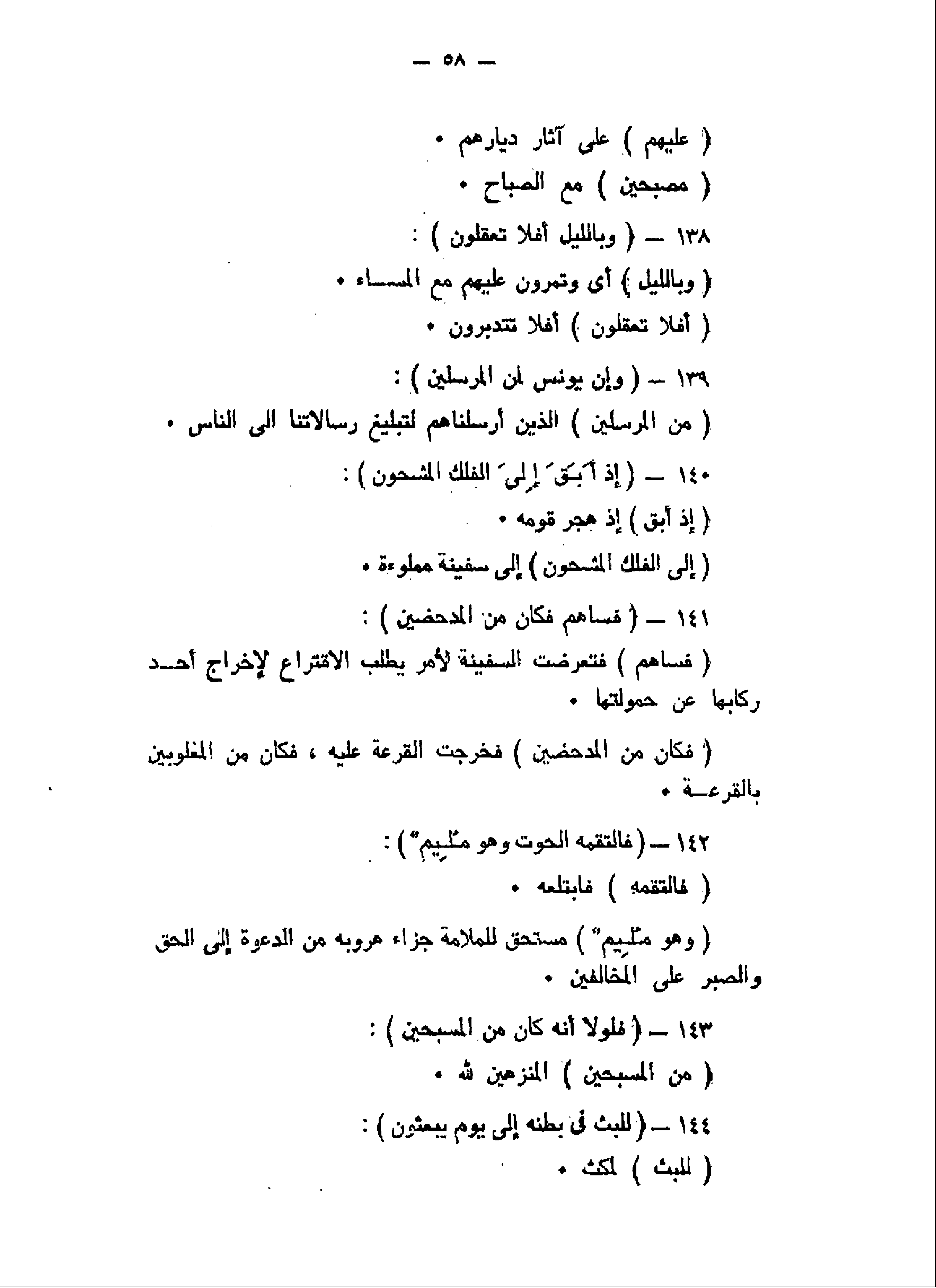 وَبِاللَّيْلِ أَفَلا تَعْقِلُونَ (138) وَإِنَّ يُونُسَ لَمِنَ الْمُرْسَلِينَ (139) إِذْ أَبَقَ إِلَى الْفُلْكِ الْمَشْحُونِ (140) فَساهَمَ فَكانَ مِنَ الْمُدْحَضِينَ (141) فَالْتَقَمَهُ الْحُوتُ وَهُوَ مُلِيمٌ (142)