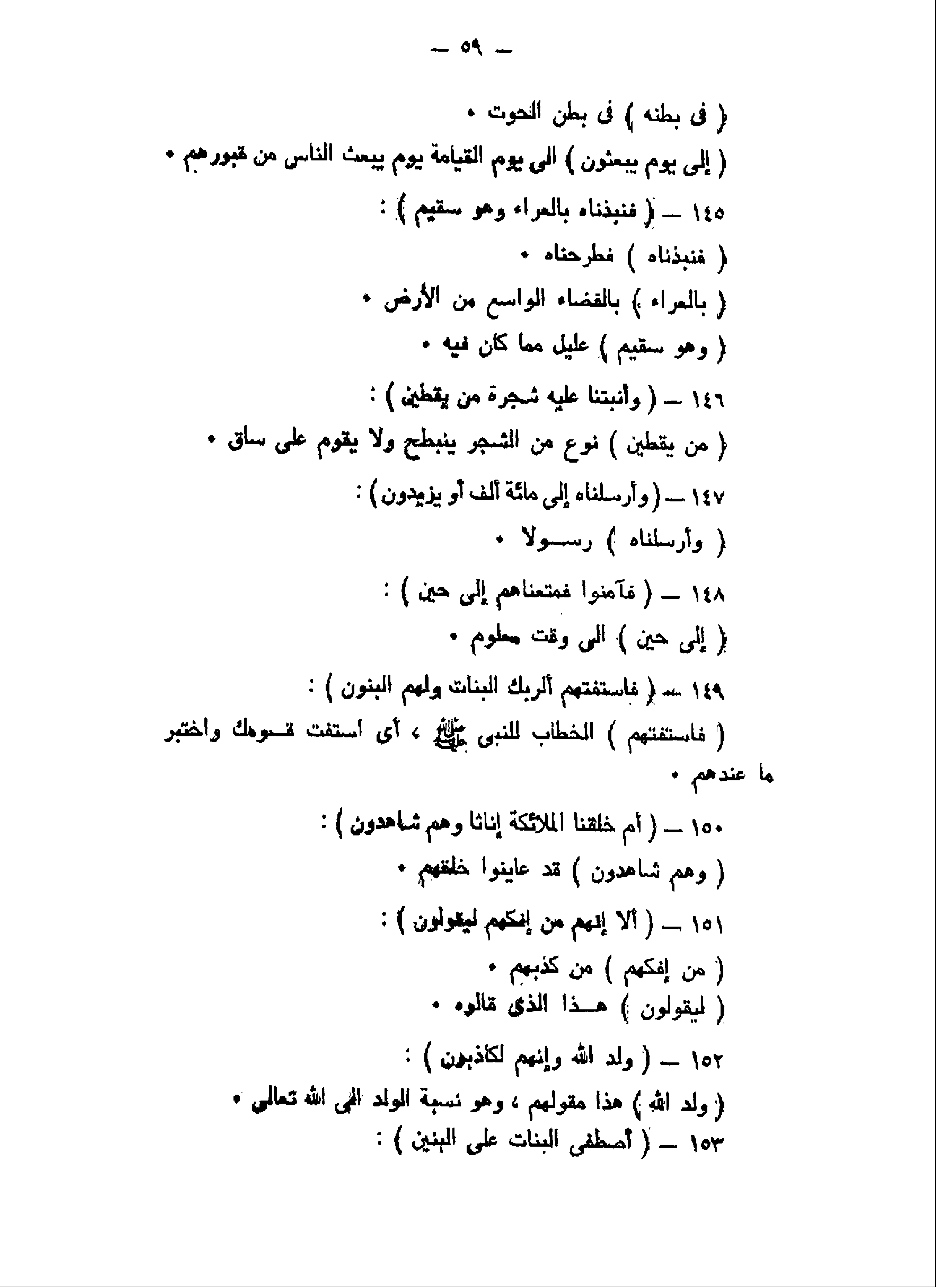 فَنَبَذْناهُ بِالْعَراءِ وَهُوَ سَقِيمٌ (145) وَأَنْبَتْنا عَلَيْهِ شَجَرَةً مِنْ يَقْطِينٍ (146) وَأَرْسَلْناهُ إِلى مِائَةِ أَلْفٍ أَوْ يَزِيدُونَ (147) فَآمَنُوا فَمَتَّعْناهُمْ إِلى حِينٍ (148) فَاسْتَفْتِهِمْ أَلِرَبِّكَ الْبَناتُ وَلَهُمُ الْبَنُونَ (149)