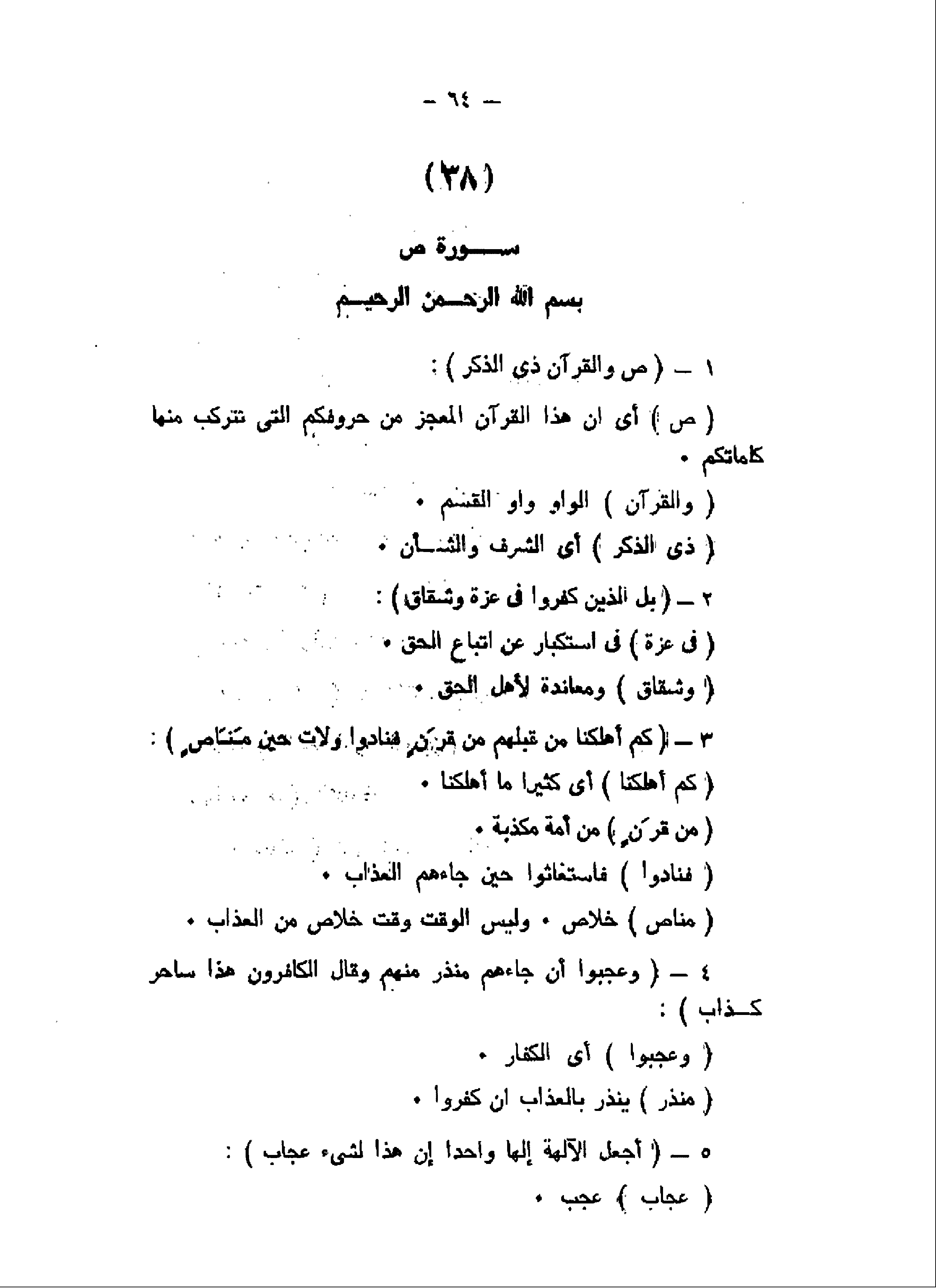 ص وَالْقُرْآنِ ذِي الذِّكْرِ (1) بَلِ الَّذِينَ كَفَرُوا فِي عِزَّةٍ وَشِقاقٍ (2) كَمْ أَهْلَكْنا مِنْ قَبْلِهِمْ مِنْ قَرْنٍ فَنادَوْا وَلاتَ حِينَ مَناصٍ (3) وَعَجِبُوا أَنْ جاءَهُمْ مُنْذِرٌ مِنْهُمْ وَقالَ الْكافِرُونَ هذا ساحِرٌ كَذَّابٌ (4)