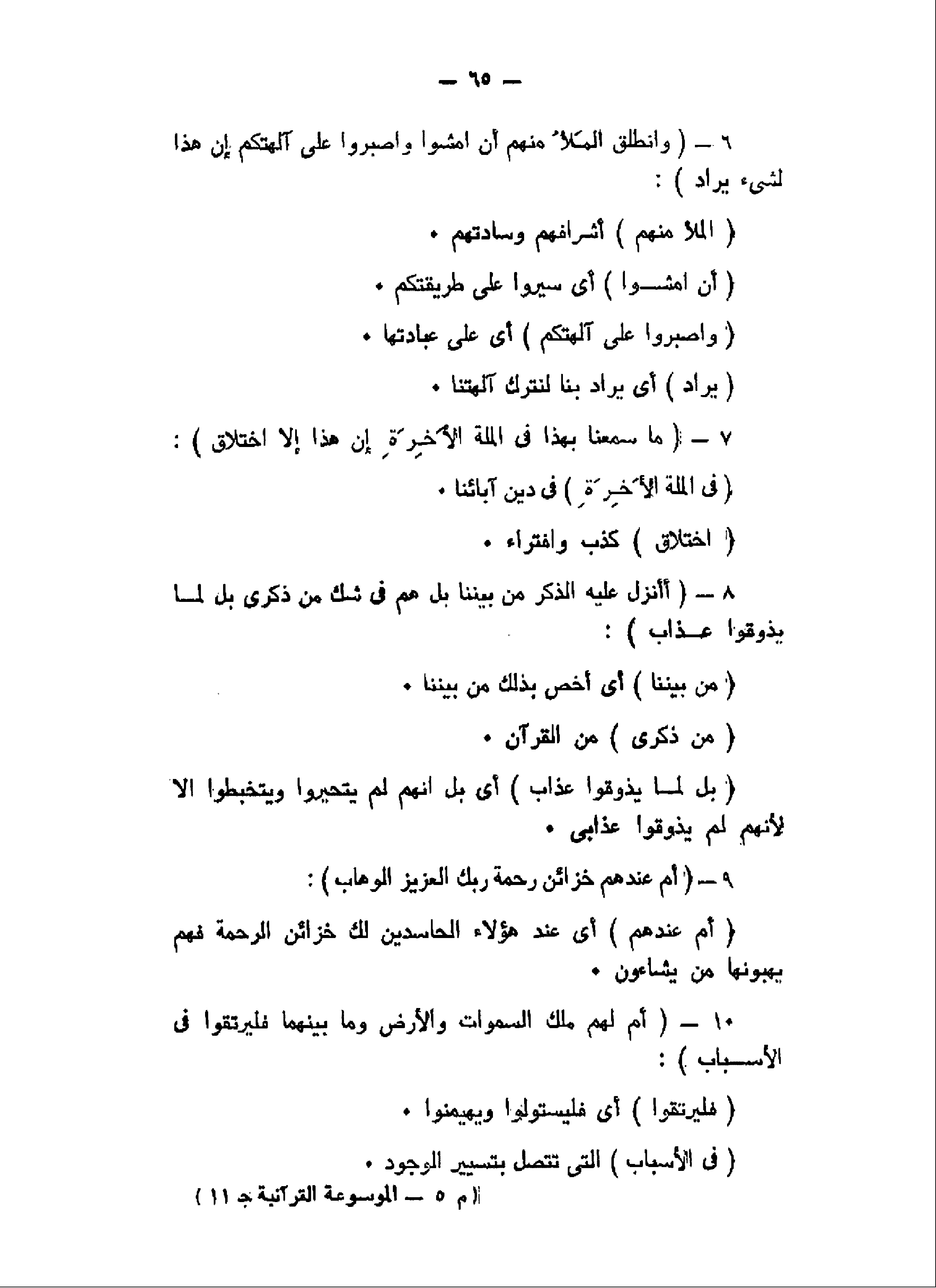 وَانْطَلَقَ الْمَلَأُ مِنْهُمْ أَنِ امْشُوا وَاصْبِرُوا عَلى آلِهَتِكُمْ إِنَّ هذا لَشَيْءٌ يُرادُ (6) ما سَمِعْنا بِهذا فِي الْمِلَّةِ الْآخِرَةِ إِنْ هذا إِلاَّ اخْتِلاقٌ (7) أَأُنْزِلَ عَلَيْهِ الذِّكْرُ مِنْ بَيْنِنا بَلْ هُمْ فِي شَكٍّ مِنْ ذِكْرِي بَلْ لَمَّا يَذُوقُوا عَذابِ (8) أَمْ عِنْدَهُمْ خَزائِنُ رَحْمَةِ رَبِّكَ الْعَزِيزِ الْوَهَّابِ (9)