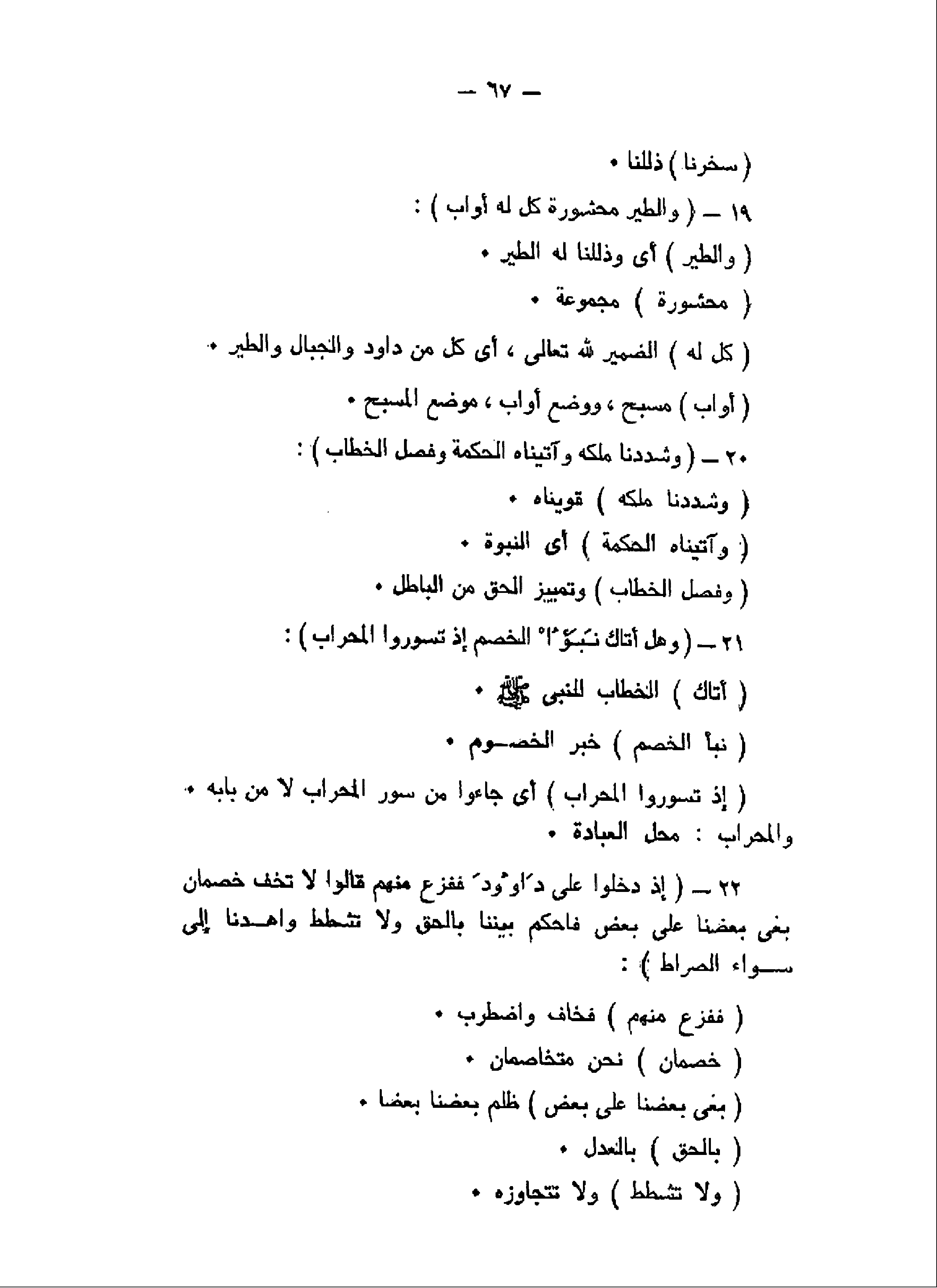 وَالطَّيْرَ مَحْشُورَةً كُلٌّ لَهُ أَوَّابٌ (19) وَشَدَدْنا مُلْكَهُ وَآتَيْناهُ الْحِكْمَةَ وَفَصْلَ الْخِطابِ (20) وَهَلْ أَتاكَ نَبَأُ الْخَصْمِ إِذْ تَسَوَّرُوا الْمِحْرابَ (21) إِذْ دَخَلُوا عَلى داوُدَ فَفَزِعَ مِنْهُمْ قالُوا لا تَخَفْ خَصْمانِ بَغى بَعْضُنا عَلى بَعْضٍ فَاحْكُمْ بَيْنَنا بِالْحَقِّ وَلا تُشْطِطْ وَاهْدِنا إِلى سَواءِ الصِّراطِ (22)