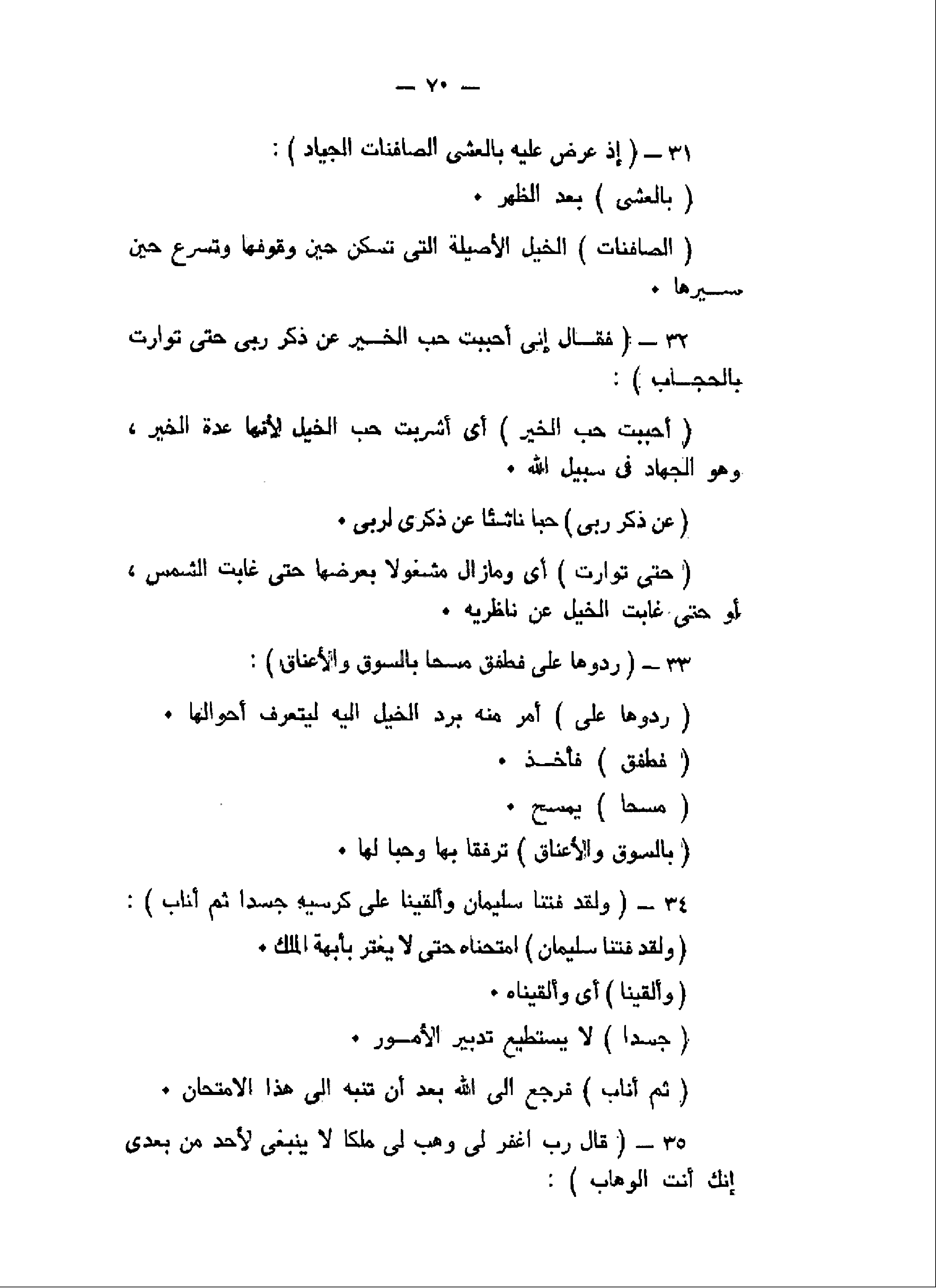 إِذْ عُرِضَ عَلَيْهِ بِالْعَشِيِّ الصَّافِناتُ الْجِيادُ (31) فَقالَ إِنِّي أَحْبَبْتُ حُبَّ الْخَيْرِ عَنْ ذِكْرِ رَبِّي حَتَّى تَوارَتْ بِالْحِجابِ (32) رُدُّوها عَلَيَّ فَطَفِقَ مَسْحاً بِالسُّوقِ وَالْأَعْناقِ (33) وَلَقَدْ فَتَنَّا سُلَيْمانَ وَأَلْقَيْنا عَلى كُرْسِيِّهِ جَسَداً ثُمَّ أَنابَ (34) قالَ رَبِّ اغْفِرْ لِي وَهَبْ لِي مُلْكاً لا يَنْبَغِي لِأَحَدٍ مِنْ بَعْدِي إِنَّكَ أَنْتَ الْوَهَّابُ (35)