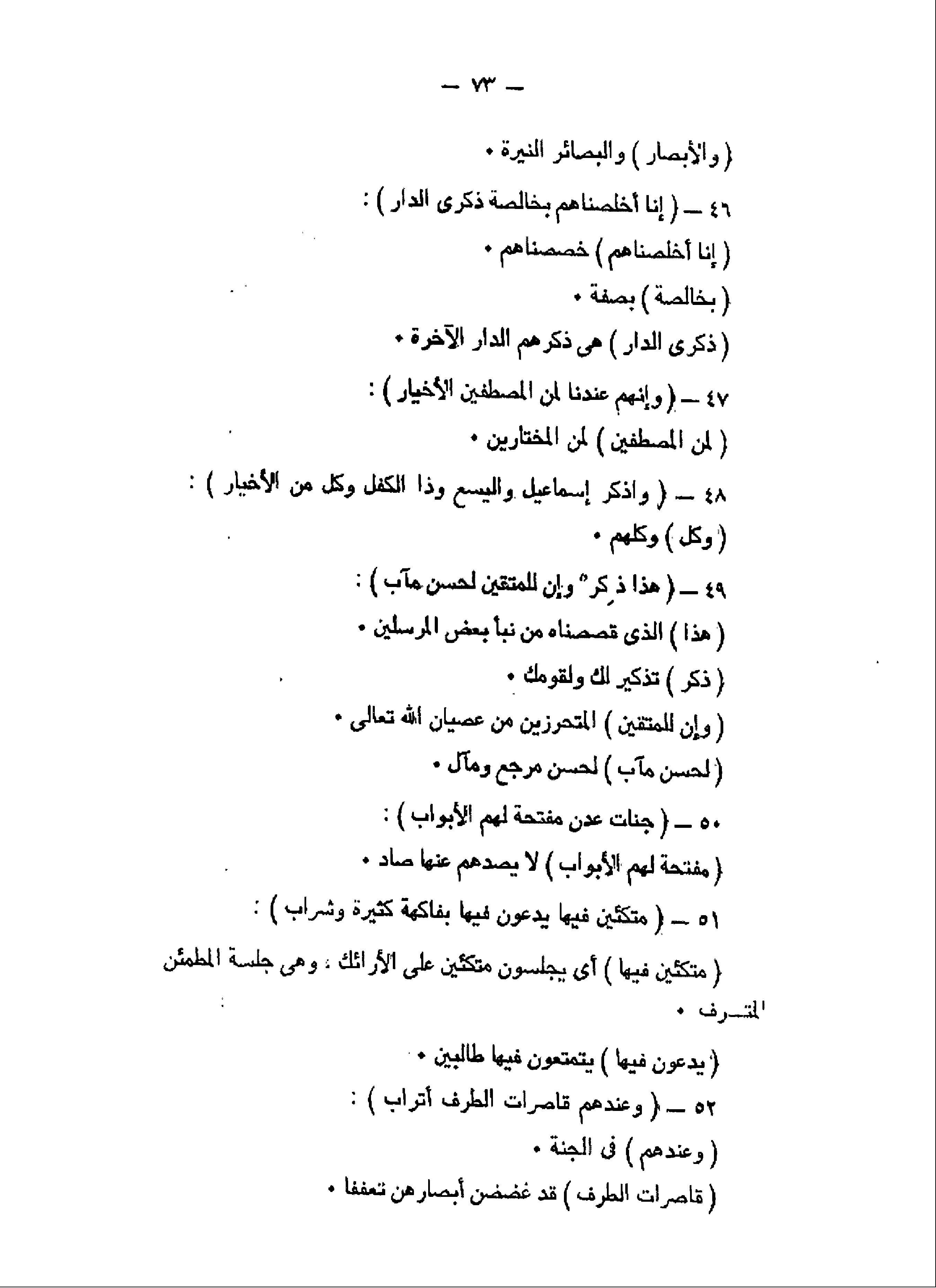 إِنَّا أَخْلَصْناهُمْ بِخالِصَةٍ ذِكْرَى الدَّارِ (46) وَإِنَّهُمْ عِنْدَنا لَمِنَ الْمُصْطَفَيْنَ الْأَخْيارِ (47) وَاذْكُرْ إِسْماعِيلَ وَالْيَسَعَ وَذَا الْكِفْلِ وَكُلٌّ مِنَ الْأَخْيارِ (48) هذا ذِكْرٌ وَإِنَّ لِلْمُتَّقِينَ لَحُسْنَ مَآبٍ (49) جَنَّاتِ عَدْنٍ مُفَتَّحَةً لَهُمُ الْأَبْوابُ (50)