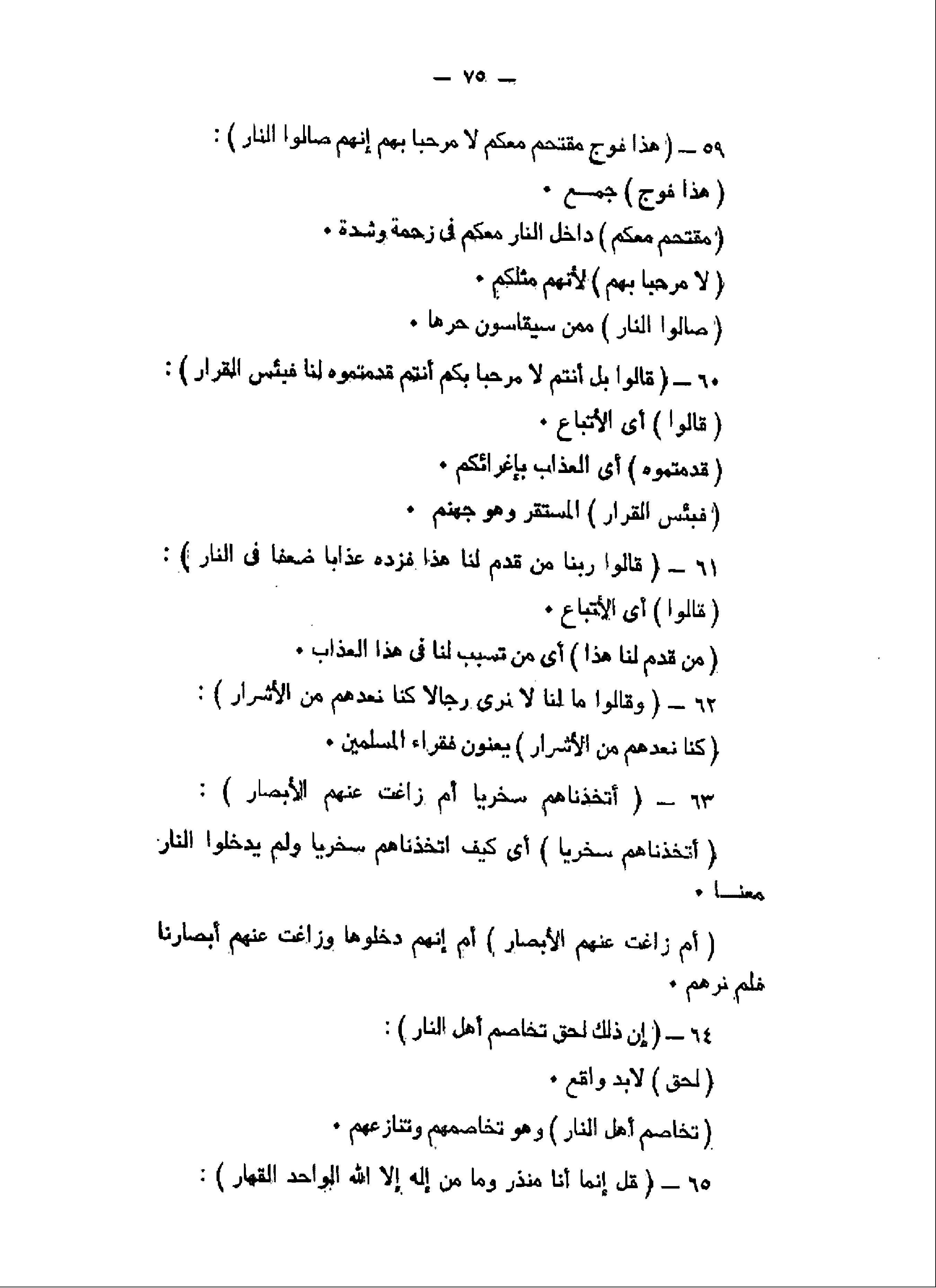 هذا فَوْجٌ مُقْتَحِمٌ مَعَكُمْ لا مَرْحَباً بِهِمْ إِنَّهُمْ صالُوا النَّارِ (59) قالُوا بَلْ أَنْتُمْ لا مَرْحَباً بِكُمْ أَنْتُمْ قَدَّمْتُمُوهُ لَنا فَبِئْسَ الْقَرارُ (60) قالُوا رَبَّنا مَنْ قَدَّمَ لَنا هذا فَزِدْهُ عَذاباً ضِعْفاً فِي النَّارِ (61) وَقالُوا ما لَنا لا نَرى رِجالاً كُنَّا نَعُدُّهُمْ مِنَ الْأَشْرارِ (62) أَتَّخَذْناهُمْ سِخْرِيًّا أَمْ زاغَتْ عَنْهُمُ الْأَبْصارُ (63)