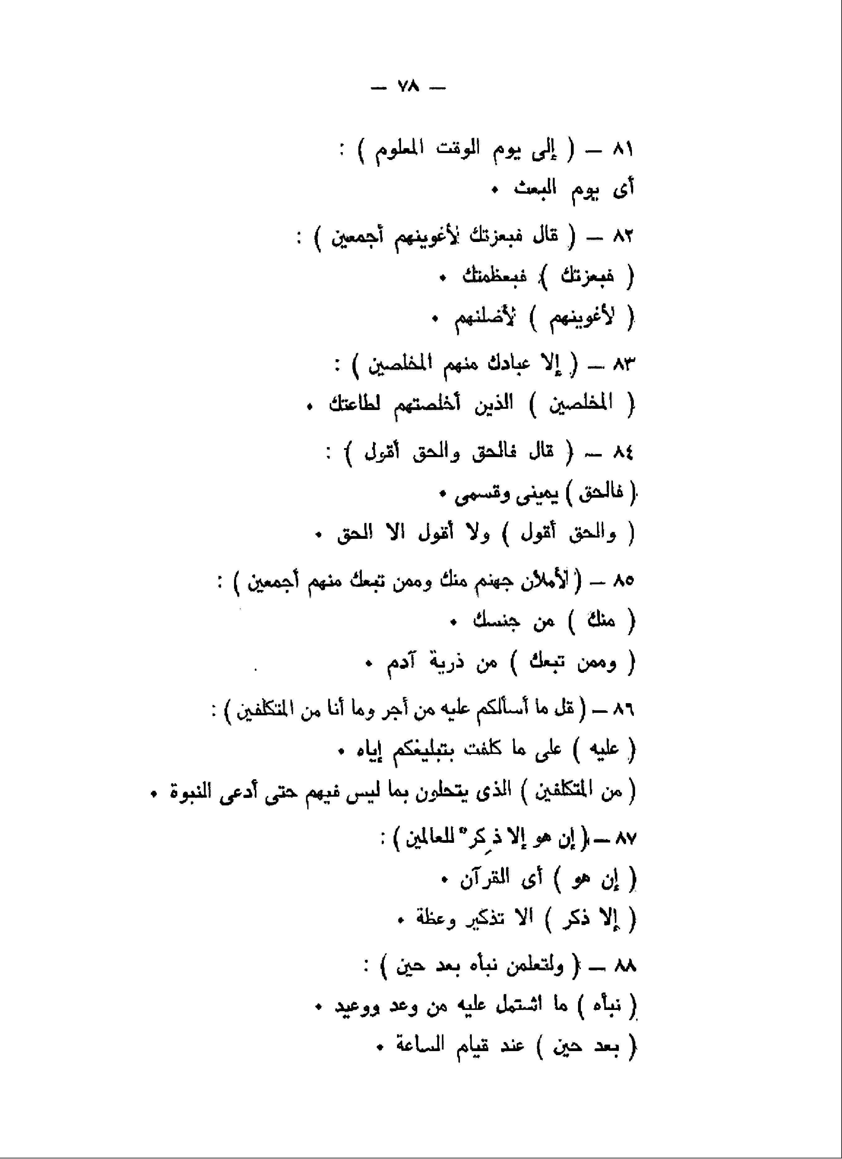 إِلى يَوْمِ الْوَقْتِ الْمَعْلُومِ (81) قالَ فَبِعِزَّتِكَ لَأُغْوِيَنَّهُمْ أَجْمَعِينَ (82) إِلاَّ عِبادَكَ مِنْهُمُ الْمُخْلَصِينَ (83) قالَ فَالْحَقُّ وَالْحَقَّ أَقُولُ (84) لَأَمْلَأَنَّ جَهَنَّمَ مِنْكَ وَمِمَّنْ تَبِعَكَ مِنْهُمْ أَجْمَعِينَ (85)