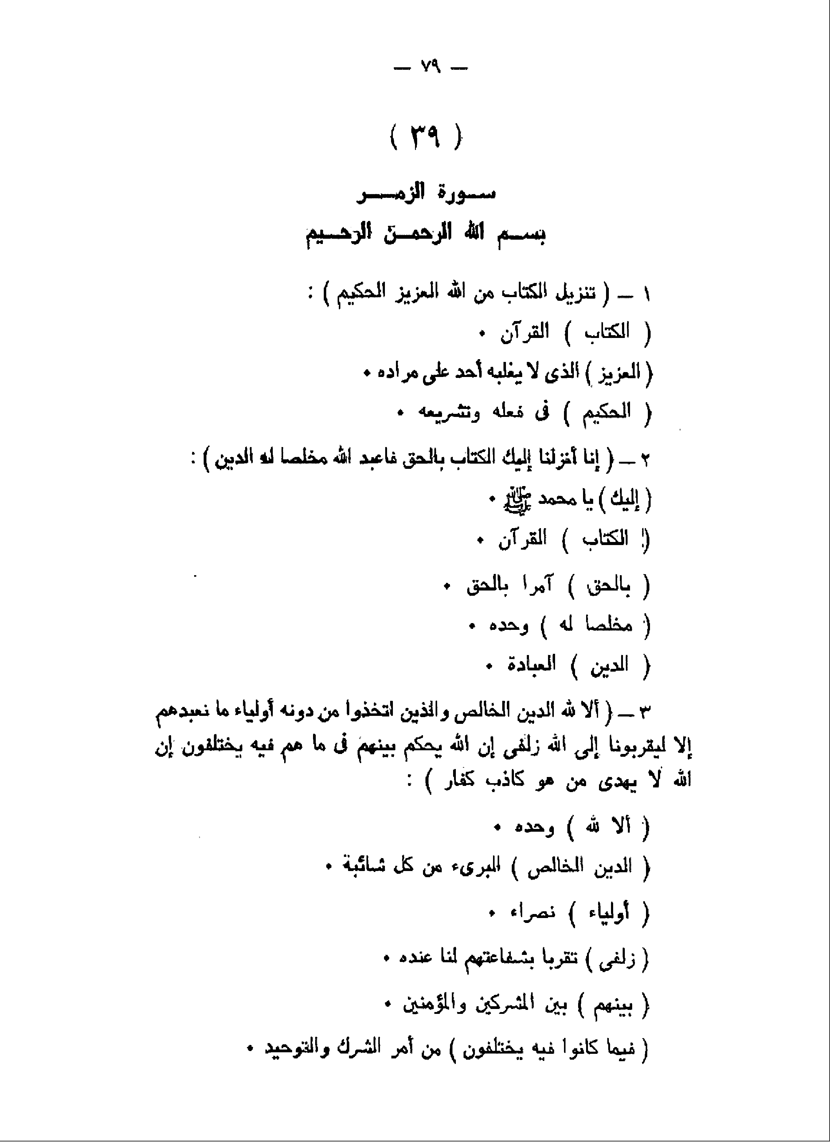 تَنْزِيلُ الْكِتابِ مِنَ اللَّهِ الْعَزِيزِ الْحَكِيمِ (1) إِنَّا أَنْزَلْنا إِلَيْكَ الْكِتابَ بِالْحَقِّ فَاعْبُدِ اللَّهَ مُخْلِصاً لَهُ الدِّينَ (2) أَلا لِلَّهِ الدِّينُ الْخالِصُ وَالَّذِينَ اتَّخَذُوا مِنْ دُونِهِ أَوْلِياءَ ما نَعْبُدُهُمْ إِلاَّ لِيُقَرِّبُونا إِلَى اللَّهِ زُلْفى إِنَّ اللَّهَ يَحْكُمُ بَيْنَهُمْ فِي ما هُمْ فِيهِ يَخْتَلِفُونَ إِنَّ اللَّهَ لا يَهْدِي مَنْ هُوَ كاذِبٌ كَفَّارٌ (3)