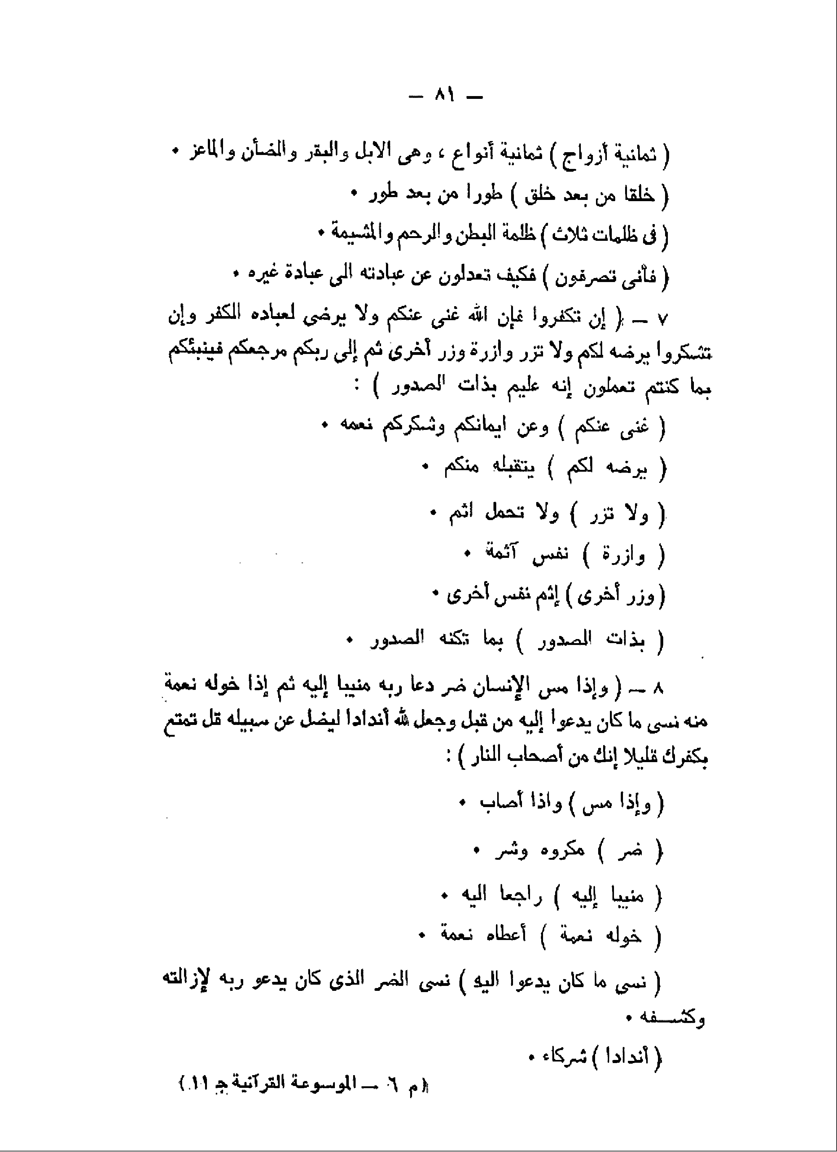 إِنْ تَكْفُرُوا فَإِنَّ اللَّهَ غَنِيٌّ عَنْكُمْ وَلا يَرْضى لِعِبادِهِ الْكُفْرَ وَإِنْ تَشْكُرُوا يَرْضَهُ لَكُمْ وَلا تَزِرُ وازِرَةٌ وِزْرَ أُخْرى ثُمَّ إِلى رَبِّكُمْ مَرْجِعُكُمْ فَيُنَبِّئُكُمْ بِما كُنْتُمْ تَعْمَلُونَ إِنَّهُ عَلِيمٌ بِذاتِ الصُّدُورِ (7) وَإِذا مَسَّ الْإِنْسانَ ضُرٌّ دَعا رَبَّهُ مُنِيباً إِلَيْهِ ثُمَّ إِذا خَوَّلَهُ نِعْمَةً مِنْهُ نَسِيَ ما كانَ يَدْعُوا إِلَيْهِ مِنْ قَبْلُ وَجَعَلَ لِلَّهِ أَنْداداً لِيُضِلَّ عَنْ سَبِيلِهِ قُلْ تَمَتَّعْ بِكُفْرِكَ قَلِيلاً إِنَّكَ مِنْ أَصْحابِ النَّارِ (8)