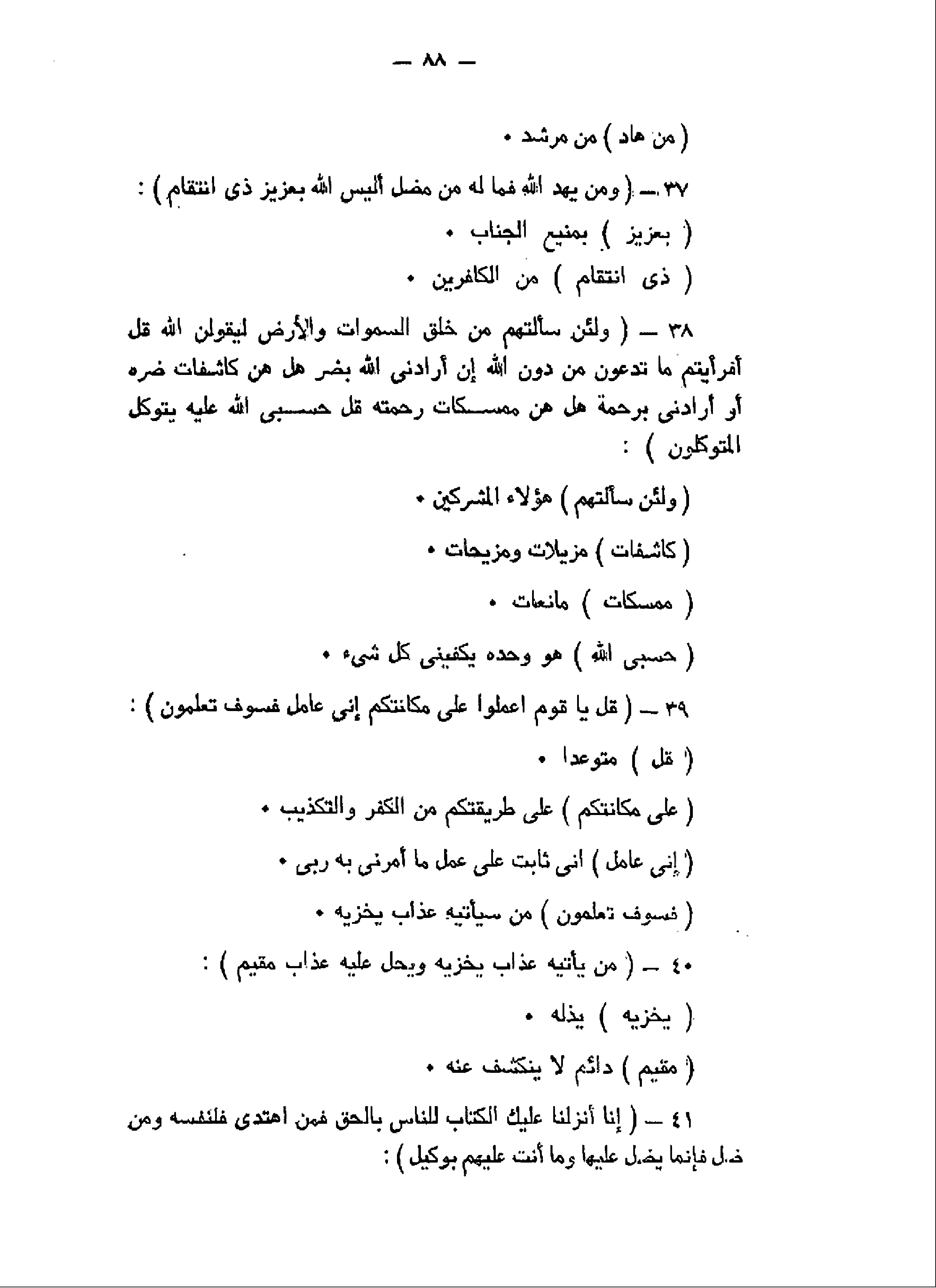 وَمَنْ يَهْدِ اللَّهُ فَما لَهُ مِنْ مُضِلٍّ أَلَيْسَ اللَّهُ بِعَزِيزٍ ذِي انْتِقامٍ (37) وَلَئِنْ سَأَلْتَهُمْ مَنْ خَلَقَ السَّماواتِ وَالْأَرْضَ لَيَقُولُنَّ اللَّهُ قُلْ أَفَرَأَيْتُمْ ما تَدْعُونَ مِنْ دُونِ اللَّهِ إِنْ أَرادَنِيَ اللَّهُ بِضُرٍّ هَلْ هُنَّ كاشِفاتُ ضُرِّهِ أَوْ أَرادَنِي بِرَحْمَةٍ هَلْ هُنَّ مُمْسِكاتُ رَحْمَتِهِ قُلْ حَسْبِيَ اللَّهُ عَلَيْهِ يَتَوَكَّلُ الْمُتَوَكِّلُونَ (38) قُلْ يا قَوْمِ اعْمَلُوا عَلى مَكانَتِكُمْ إِنِّي عامِلٌ فَسَوْفَ تَعْلَمُونَ (39) مَنْ يَأْتِيهِ عَذابٌ يُخْزِيهِ وَيَحِلُّ عَلَيْهِ عَذابٌ مُقِيمٌ (40) إِنَّا أَنْزَلْنا عَلَيْكَ الْكِتابَ لِلنَّاسِ بِالْحَقِّ فَمَنِ اهْتَدى فَلِنَفْسِهِ وَمَنْ ضَلَّ فَإِنَّما يَضِلُّ عَلَيْها وَما أَنْتَ عَلَيْهِمْ بِوَكِيلٍ (41)