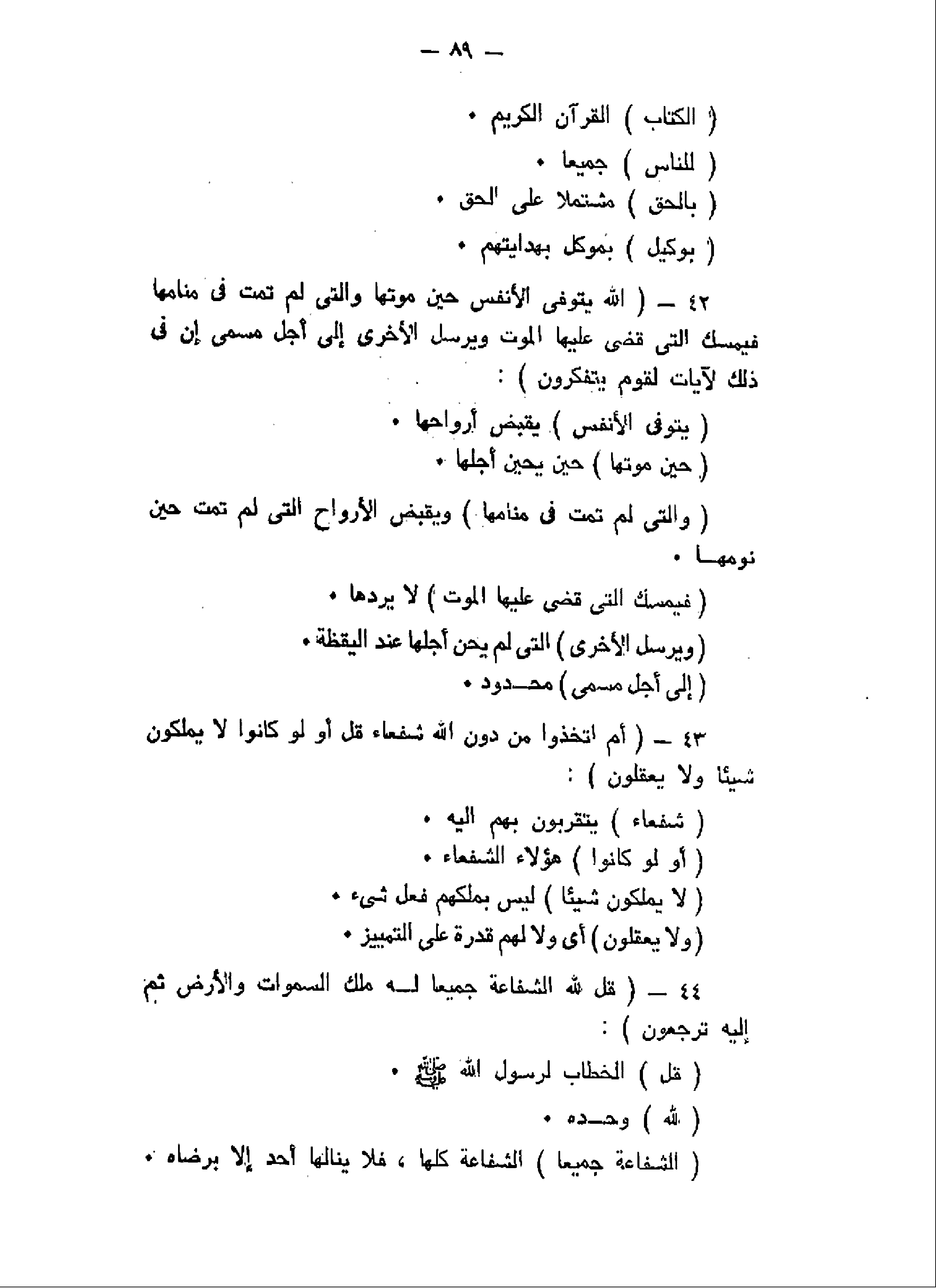 اللَّهُ يَتَوَفَّى الْأَنْفُسَ حِينَ مَوْتِها وَالَّتِي لَمْ تَمُتْ فِي مَنامِها فَيُمْسِكُ الَّتِي قَضى عَلَيْهَا الْمَوْتَ وَيُرْسِلُ الْأُخْرى إِلى أَجَلٍ مُسَمًّى إِنَّ فِي ذلِكَ لَآياتٍ لِقَوْمٍ يَتَفَكَّرُونَ (42) أَمِ اتَّخَذُوا مِنْ دُونِ اللَّهِ شُفَعاءَ قُلْ أَوَلَوْ كانُوا لا يَمْلِكُونَ شَيْئاً وَلا يَعْقِلُونَ (43) قُلْ لِلَّهِ الشَّفاعَةُ جَمِيعاً لَهُ مُلْكُ السَّماواتِ وَالْأَرْضِ ثُمَّ إِلَيْهِ تُرْجَعُونَ (44)