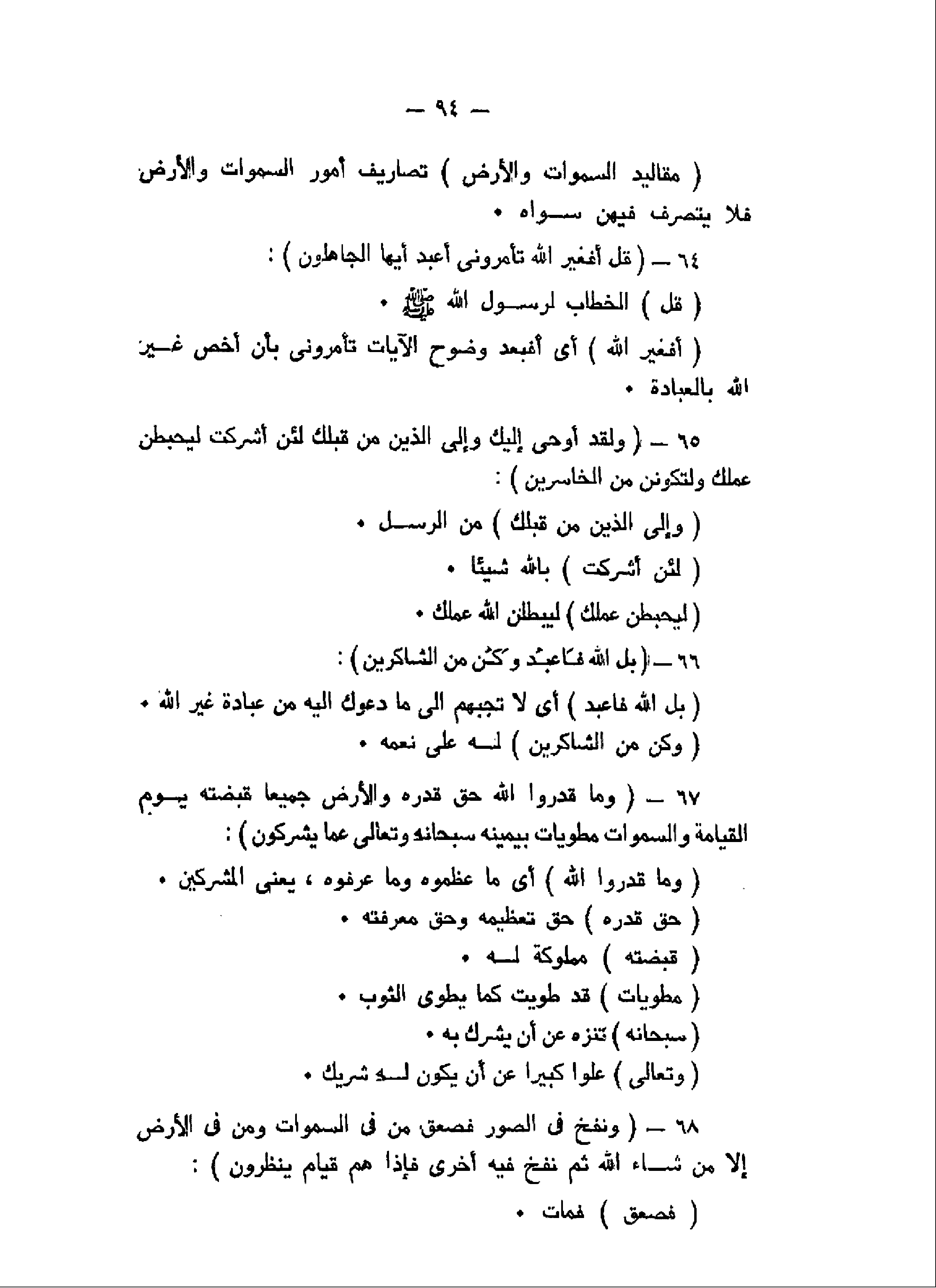 قُلْ أَفَغَيْرَ اللَّهِ تَأْمُرُونِّي أَعْبُدُ أَيُّهَا الْجاهِلُونَ (64) وَلَقَدْ أُوحِيَ إِلَيْكَ وَإِلَى الَّذِينَ مِنْ قَبْلِكَ لَئِنْ أَشْرَكْتَ لَيَحْبَطَنَّ عَمَلُكَ وَلَتَكُونَنَّ مِنَ الْخاسِرِينَ (65) بَلِ اللَّهَ فَاعْبُدْ وَكُنْ مِنَ الشَّاكِرِينَ (66) وَما قَدَرُوا اللَّهَ حَقَّ قَدْرِهِ وَالْأَرْضُ جَمِيعاً قَبْضَتُهُ يَوْمَ الْقِيامَةِ وَالسَّماواتُ مَطْوِيَّاتٌ بِيَمِينِهِ سُبْحانَهُ وَتَعالى عَمَّا يُشْرِكُونَ (67) وَنُفِخَ فِي الصُّورِ فَصَعِقَ مَنْ فِي السَّماواتِ وَمَنْ فِي الْأَرْضِ إِلاَّ مَنْ شاءَ اللَّهُ ثُمَّ نُفِخَ فِيهِ أُخْرى فَإِذا هُمْ قِيامٌ يَنْظُرُونَ (68)