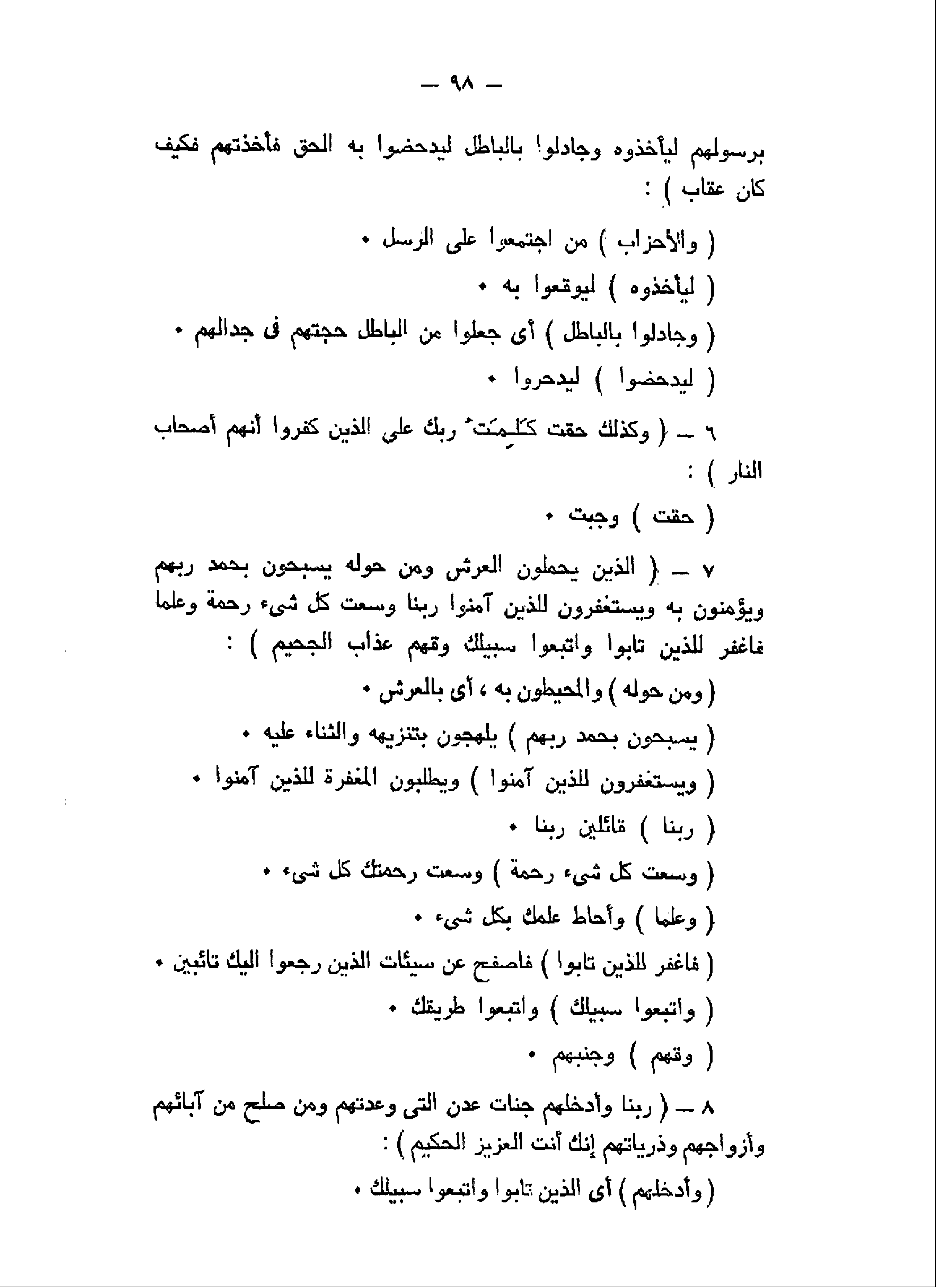 وَكَذلِكَ حَقَّتْ كَلِمَةُ رَبِّكَ عَلَى الَّذِينَ كَفَرُوا أَنَّهُمْ أَصْحابُ النَّارِ (6) الَّذِينَ يَحْمِلُونَ الْعَرْشَ وَمَنْ حَوْلَهُ يُسَبِّحُونَ بِحَمْدِ رَبِّهِمْ وَيُؤْمِنُونَ بِهِ وَيَسْتَغْفِرُونَ لِلَّذِينَ آمَنُوا رَبَّنا وَسِعْتَ كُلَّ شَيْءٍ رَحْمَةً وَعِلْماً فَاغْفِرْ لِلَّذِينَ تابُوا وَاتَّبَعُوا سَبِيلَكَ وَقِهِمْ عَذابَ الْجَحِيمِ (7) رَبَّنا وَأَدْخِلْهُمْ جَنَّاتِ عَدْنٍ الَّتِي وَعَدْتَهُمْ وَمَنْ صَلَحَ مِنْ آبائِهِمْ وَأَزْواجِهِمْ وَذُرِّيَّاتِهِمْ إِنَّكَ أَنْتَ الْعَزِيزُ الْحَكِيمُ (8)