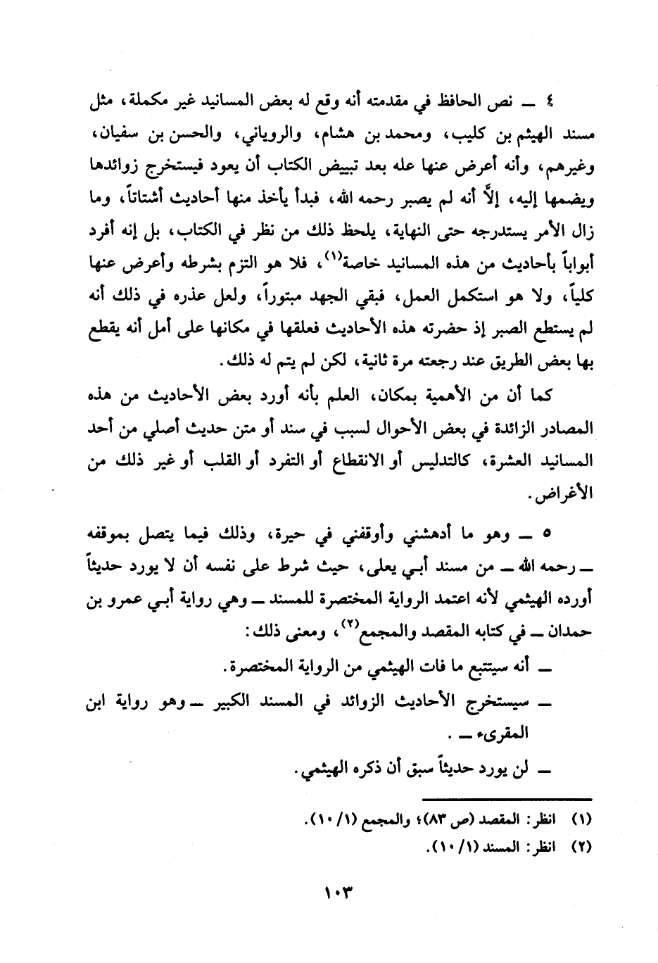 5 - وهو ما أدهشني وأوقفني في حيرة، وذلك فيما يتصل بموقفه -رحمه الله- من مسند أبي يعلى، حيث شرط على نفسه أن لا يورد حديثاً أورده الهيثمي لأنه اعتمد الرواية المختصرة للمسند -وهي رواية أبي عمرو بن حمدان- في كتابه المقصد والمجمع (¬2)، ومعنى ذلك:
