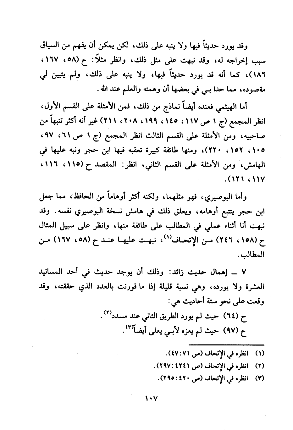 7 - إهمال حديث زائد: وذلك أن يوجد حديث في أحد المسانيد العشرة ولا يورده، وهي نسبة قليلة إذا ما قورنت بالعدد الذي حققته، وقد وقعت على نحو ستة أحاديث هي: