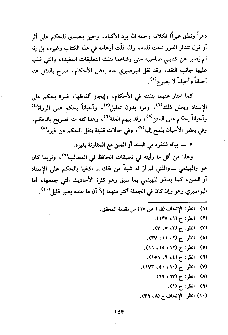 دهرًا ونطق عبرًا) فكلامه رحمه الله برد الأكباد، وحين يتصدى للحكم على أثر أو قول تتناثر الدرر تحت قلمه، ولذا قلت أوهامه في هذا الكتاب وغيره، بل إنه لم يصبر عن كتابي صاحبيه حتى وشاهما بتلك التعليقات المفيدة، والتي غلب عليها جانب النقد، وقد نقل البوصيري عنه بعض الأحكام، صرح بالنقل عنه أحيانًا وأحيانًا لا يصرح (¬1).