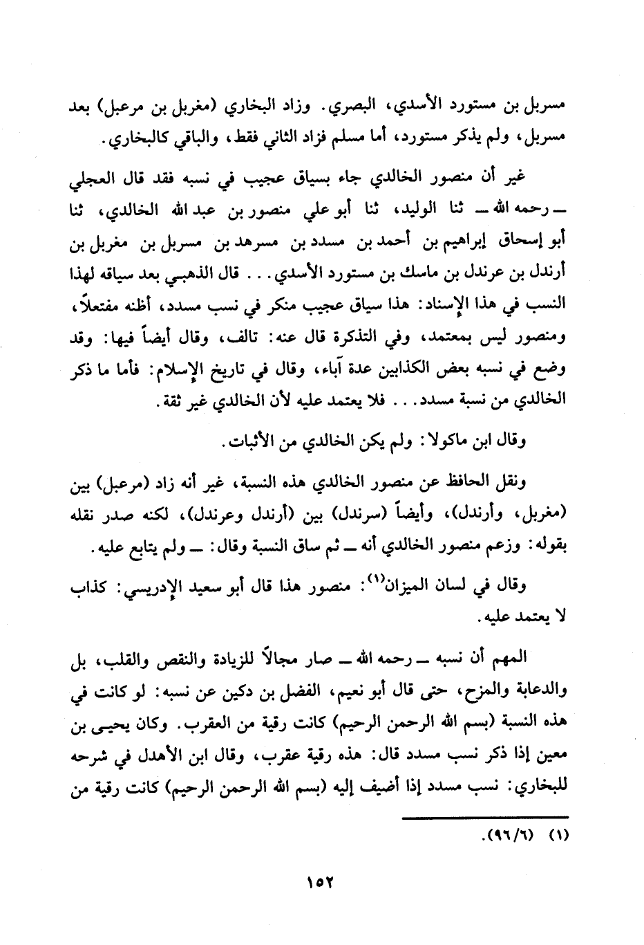 غير أن منصور الخالدي جاء بسياق عجيب في نسبه فقد قال العجلي -رحمه الله- ثنا الوليد، ثنا أبو علي منصور بن عبد الله الخالدي، ثنا أبو إسحاق إبراهيم بن أحمد بن مسدد بن مسرهد بن مسربل بن مغربل بن أرندل بن عرندل بن ماسك بن مستورد الأسدي ... قال الذهبي بعد سياقه لهذا النسب في هذا الإسناد: هذا سياق عجيب منكر في نسب مسدد، أظنه مفتعلًا، ومنصور ليس بمعتمد، وفي التذكرة قال عنه: تالف، وقال أيضًا فيها: وقد وضع في نسبه بعض الكذابين عدة آباء، وقال في تاريخ الإسلام: فأما ما ذكر الخالدي من نسبة مسدد ... فلا يعتمد عليه لأن الخالدي غير ثقة.
