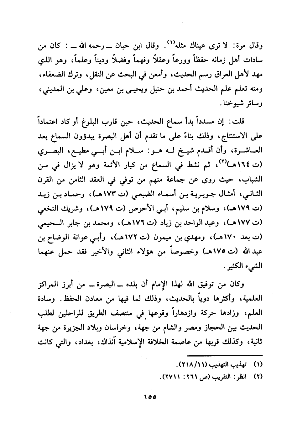 وقال مرة: لا ترى عيناك مثله (¬1). وقال ابن حبان -رحمه الله-: كان من سادات أهل زمانه حفظًا وورعًا وعقلًا وفهمًا وفضلًا ودينًا وعلمًا، وهو الذي مهد لأهل العراق رسم الحديث، وأمعن في البحث عن النقل، وترك الضعفاء، ومنه تعلم علم الحديث أحمد بن حنبل ويحيى بن معين، وعلي بن المديني، وسائر شيوخنا.
