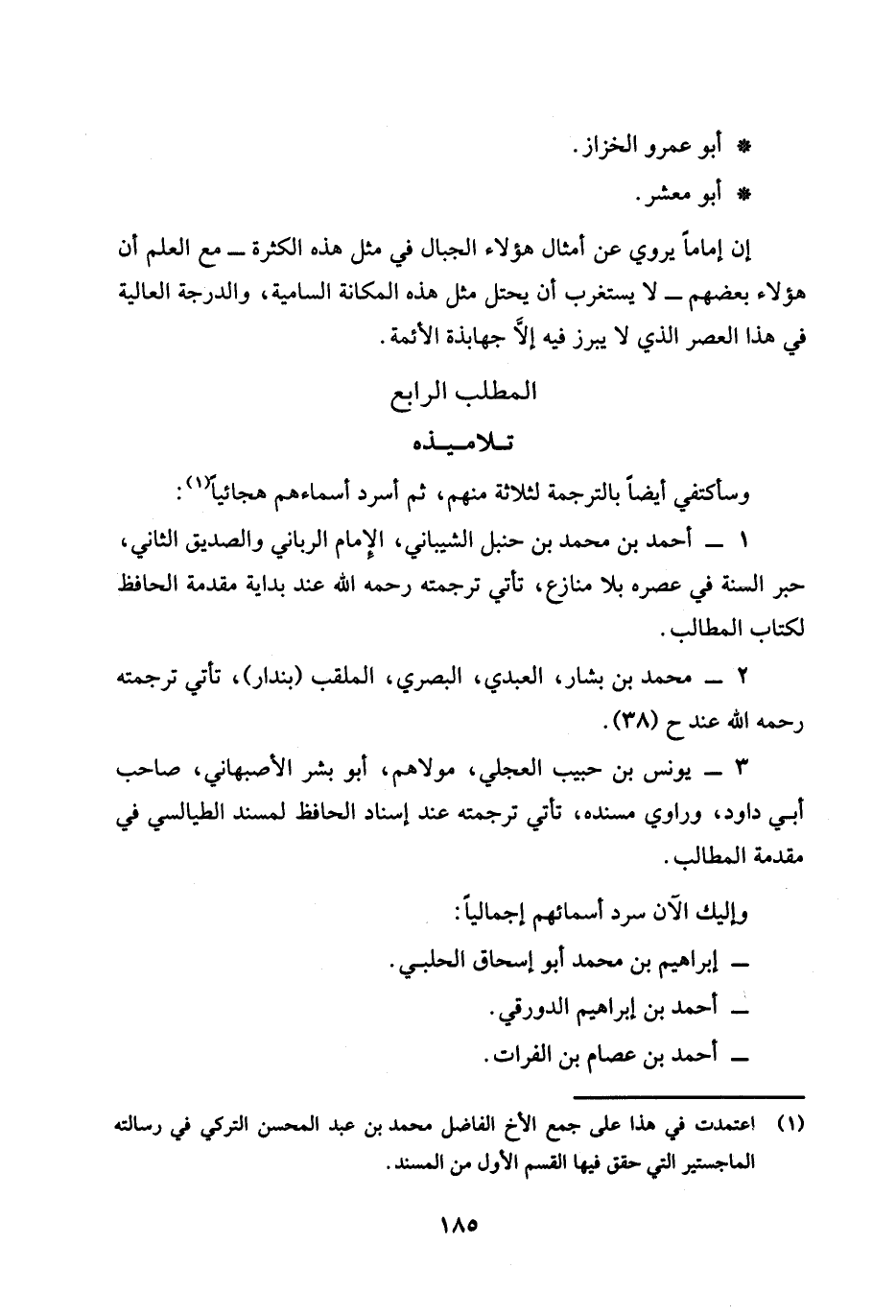 1 - أحمد بن محمد بن حنبل الشيباني، الإمام الرباني والصديق الثاني، حبر السنة في عصره بلا منازع، تأتي ترجمته رحمه الله عند بداية مقدمة الحافظ لكتاب المطالب.
