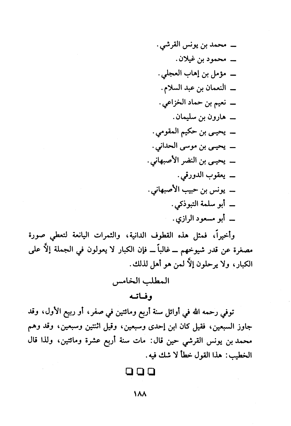 توفي رحمه الله في أوائل سنة أربع ومائتين في صفر، أو ربيع الأول، وقد جاوز السبعين، فقيل كان ابن إحدى وسبعين، وقيل اثنتين وسبعين، وقد وهم محمد بن يونس القرشي حين قال: مات سنة أربع عشرة ومائتين، ولذا قال الخطيب: هذا القول خطأ لا شك فيه.