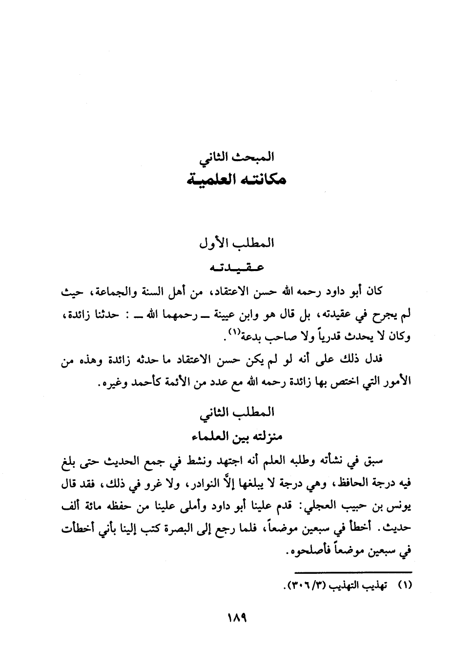 كان أبو داود رحمه الله حسن الاعتقاد، من أهل السنة والجماعة، حيث لم يجرح في عقيدته، بل قال هو وابن عيينة -رحمهما الله-: حدثنا زائدة، وكان لا يحدث قدريًا ولا صاحب بدعة (¬1).