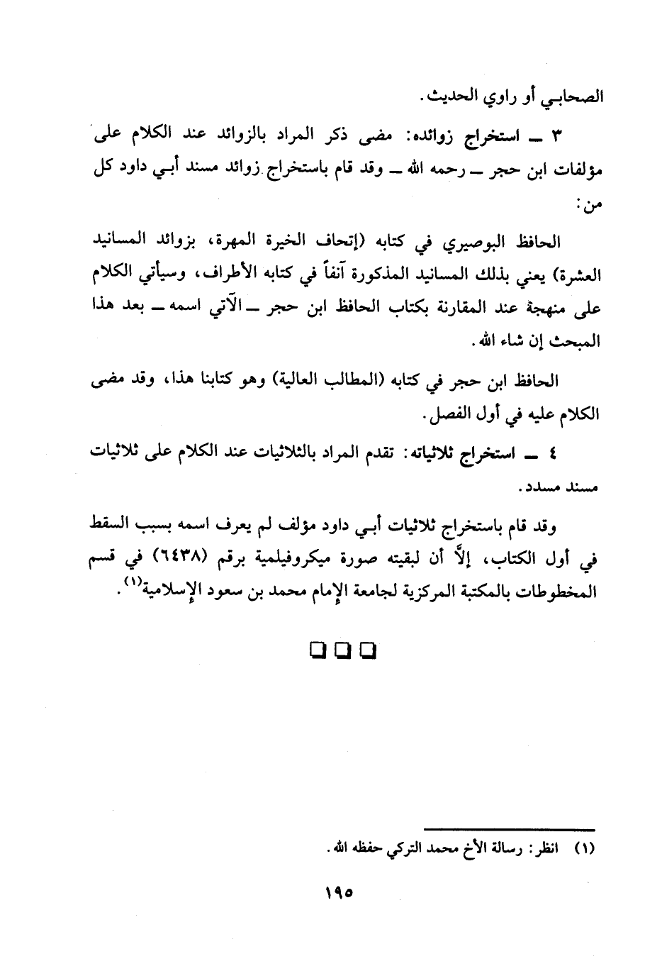 3 - استخراج زوائده: مضى ذكر المراد بالزوائد عند الكلام على مؤلفات ابن حجر -رحمه الله- وقد قام باستخراج. زوائد مسند أبي داود كل من: