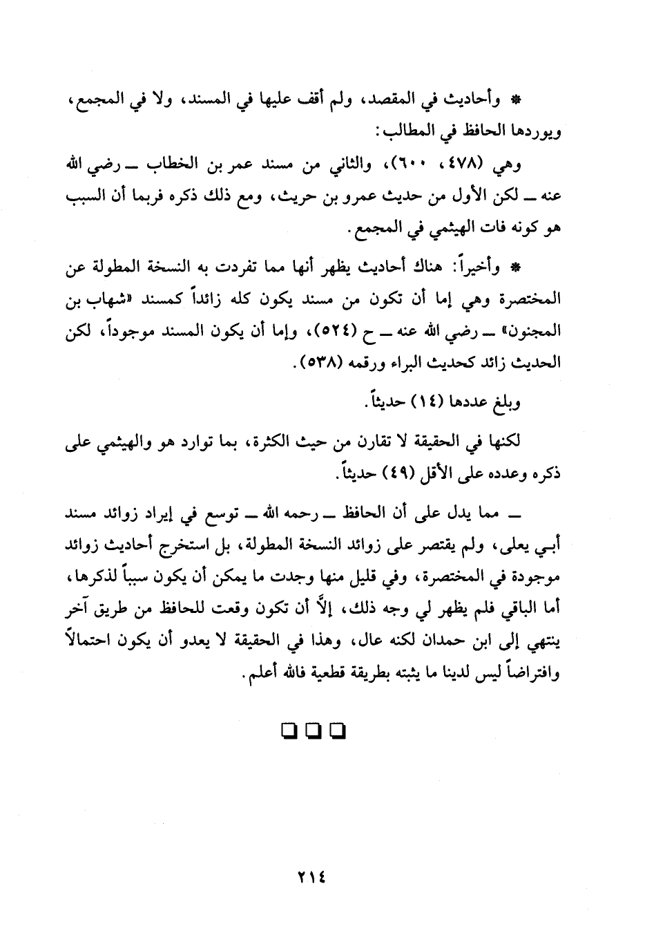- مما يدل على أن الحافظ -رحمه الله- توسع في إيراد زوائد مسند أبي يعلى، ولم يقتصر على زوائد النسخة المطولة، بل استخرج أحاديث زوائد موجودة في المختصرة، وفي قليل منها وجدت ما يمكن أن يكون سببًا لذكرها، أما الباقي فلم يظهر لي وجه ذلك، إلاَّ أن تكون وقعت للحافظ من طريق آخر ينتهي إلى ابن حمدان لكنه عال، وهذا في الحقيقة لا يعدو أن يكون احتمالًا وافتراضًا ليس لدينا ما يثبته بطريقة قطعية فالله أعلم.