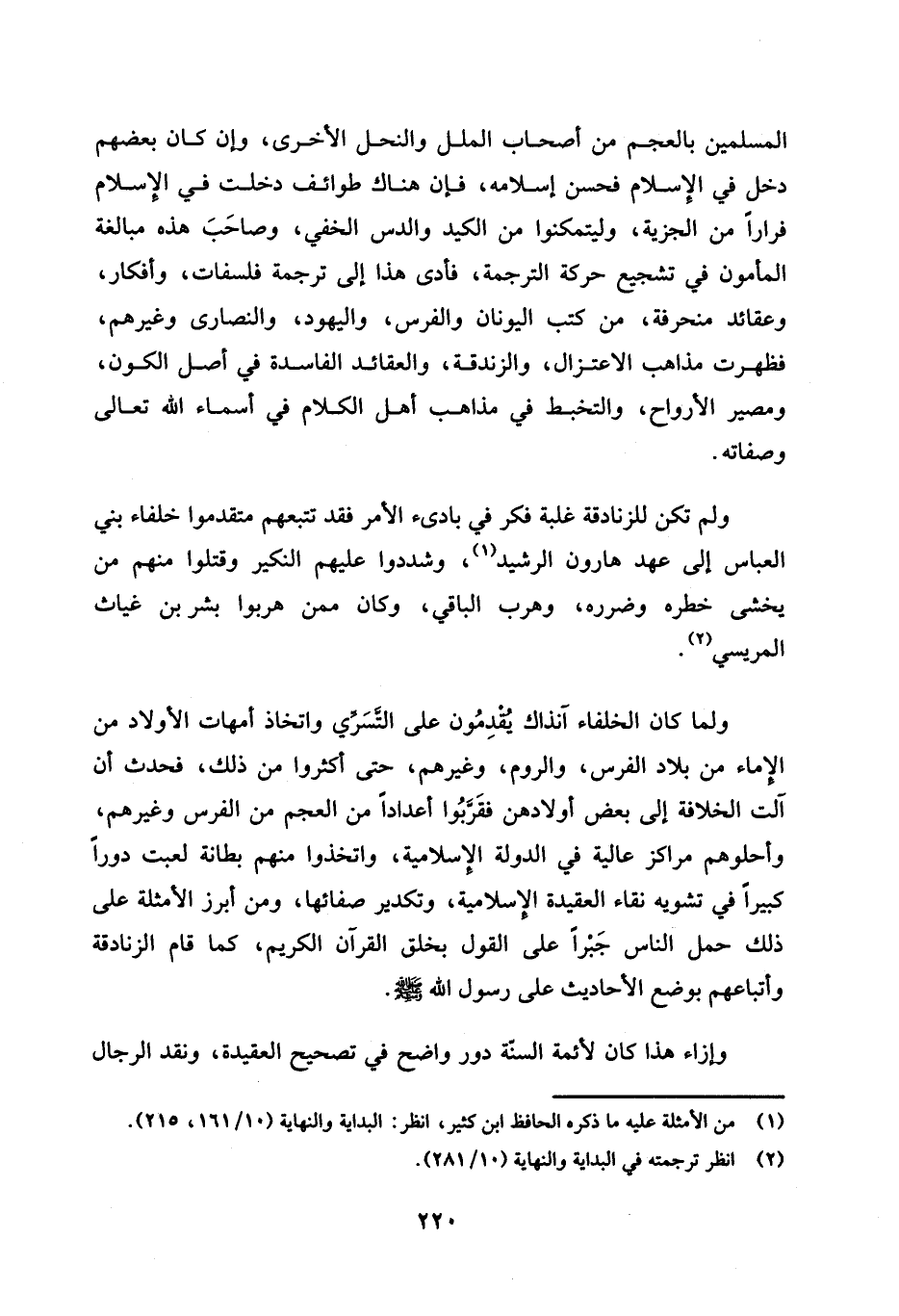 المسلمين بالعجم من أصحاب الملل والنحل الأخرى، وإن كان بعضهم دخل في الإسلام فحسن إسلامه، فإن هناك طوائف دخلت في الإسلام فرارًا من الجزية، وليتمكنوا من الكيد والدس الخفي، وصاحَبَ هذه مبالغة المأمون في تشجيع حركة الترجمة، فأدى هذا إلى ترجمة فلسفات، وأفكار، وعقائد منحرفة، من كتب اليونان والفرس، واليهود، والنصارى وغيرهم، فظهرت مذاهب الاعتزال، والزندقة، والعقائد الفاسدة في أصل الكون، ومصير الأرواح، والتخبط في مذاهب أهل الكلام في أسماء الله تعالى وصفاته.