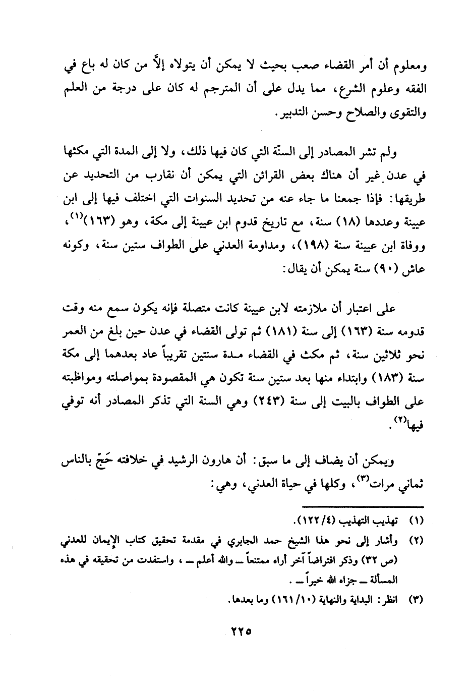 ولم تشر المصادر إلى السنة التي كان فيها ذلك، ولا إلى المدة التي مكثها في عدن غير أن هناك بعض القرائن التي يمكن أن نقارب من التحديد عن طريقها: فإذا جمعنا ما جاء عنه من تحديد السنوات التي اختلف فيها إلى ابن عيينة وعددها (18) سنة، مع تاريخ قدوم ابن عيينة إلى مكة، وهو (163) (¬1)، ووفاة ابن عيينة سنة (198)، ومداومة العدني على الطواف ستين سنة، وكونه عاش (90) سنة يمكن أن يقال: