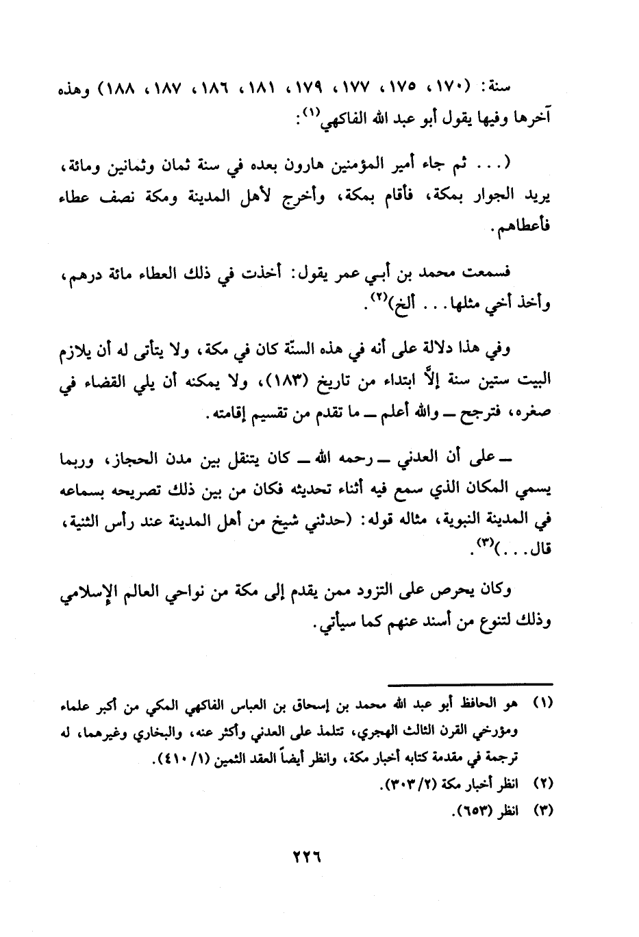 (¬1) هو الحافظ أبو عبد الله محمد بن إسحاق بن العباس الفاكهي المكي من أكبر علماء ومؤرخي القرن الثالث الهجري، تتلمذ على العدني وأكثر عنه، والبخاري وغيرهما، له ترجمة في مقدمة كتابه أخبار مكة، وانظر أيضًا العقد الثمين (1/ 410).