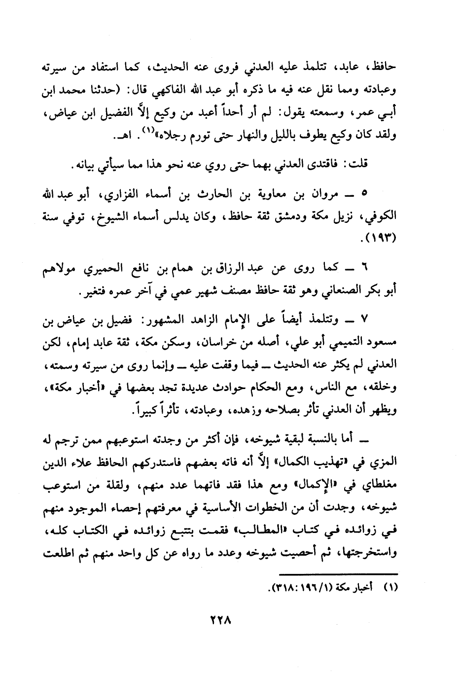 7 - وتتلمذ أيضًا على الإمام الزاهد المشهور: فضيل بن عياض بن مسعود التميمي أبو علي، أصله من خراسان، وسكن مكة، ثقة عابد إمام، لكن العدني لم يكثر عنه الحديث -فيما وقفت عليه- وإنما روى من سيرته وسمته، وخلقه، مع الناس، ومع الحكام حوادث عديدة تجد بعضها في "أخبار مكة"، ويظهر أن العدني تأثر بصلاحه وزهده، وعبادته، تأثرًا كبيرًا.