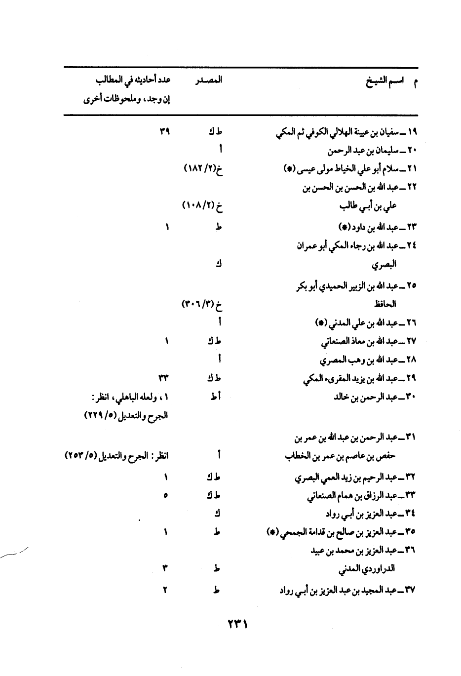 م - اسم الشيخ // المصدر // عدد أحاديثه في المطالب إن وجد، وملحوظات أخري