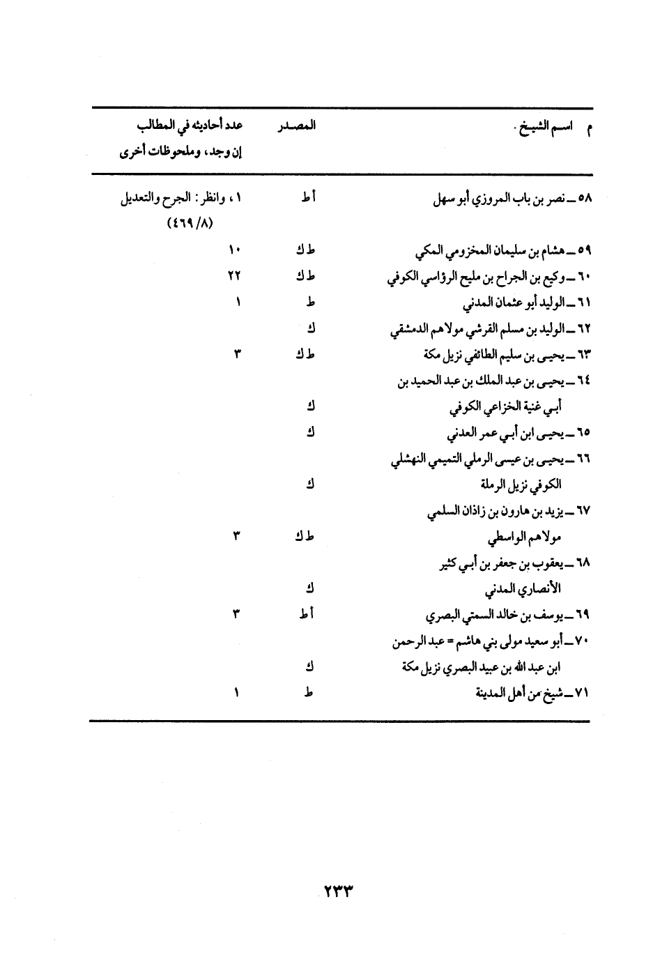 م - اسم الشيخ. // المصدر // عدد أحاديثه في المطالب إن وجد، وملحوظات أخري