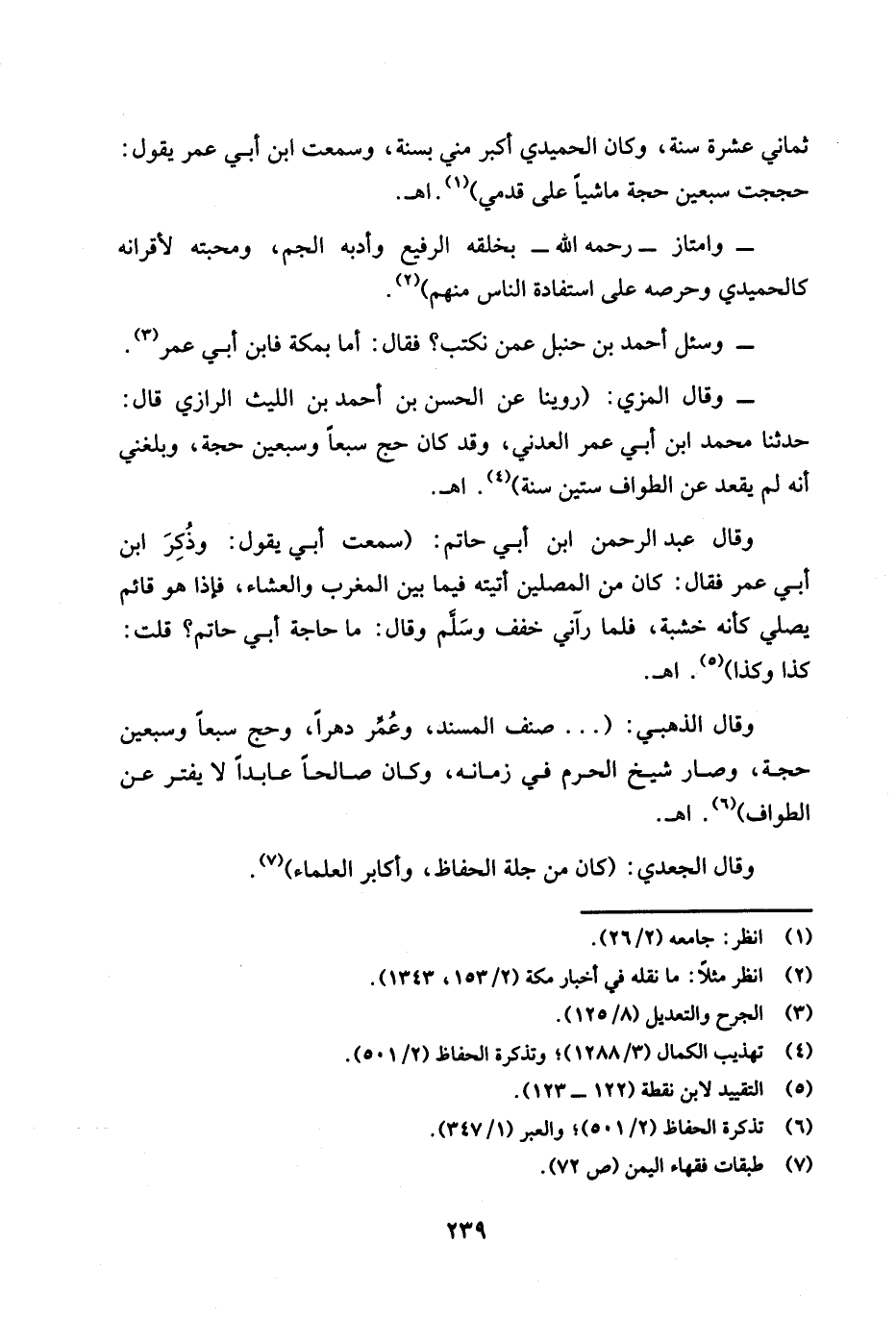 - وقال المزي: (روينا عن الحسن بن أحمد بن الليث الرازي قال: حدثنا محمد ابن أبي عمر العدني، وقد كان حج سبعًا وسبعين حجة، وبلغني أنه لم يقعد عن الطواف ستين سنة) (¬4). اهـ.