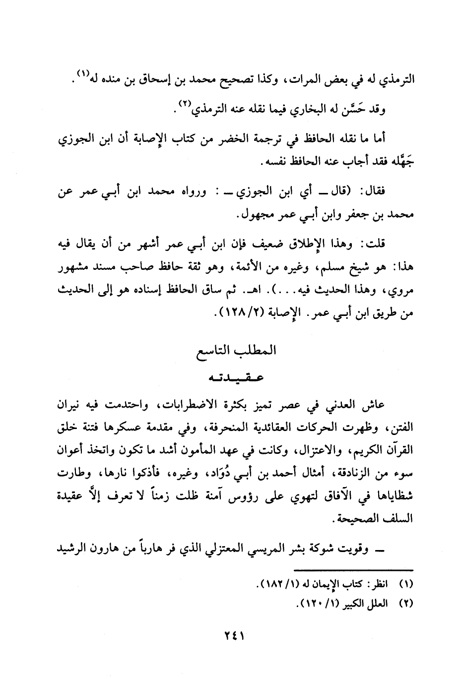 قلت: وهذا الإطلاق ضعيف فإن ابن أبي عمر أشهر من أن يقال فيه هذا: هو شيخ مسلم، وغيره من الأئمة، وهو ثقة حافظ صاحب مسند مشهور مروي، وهذا الحديث فيه ...). اهـ. ثم ساق الحافظ إسناده هو إلى الحديث من طريق ابن أبي عمر. الإصابة (2/ 128).
