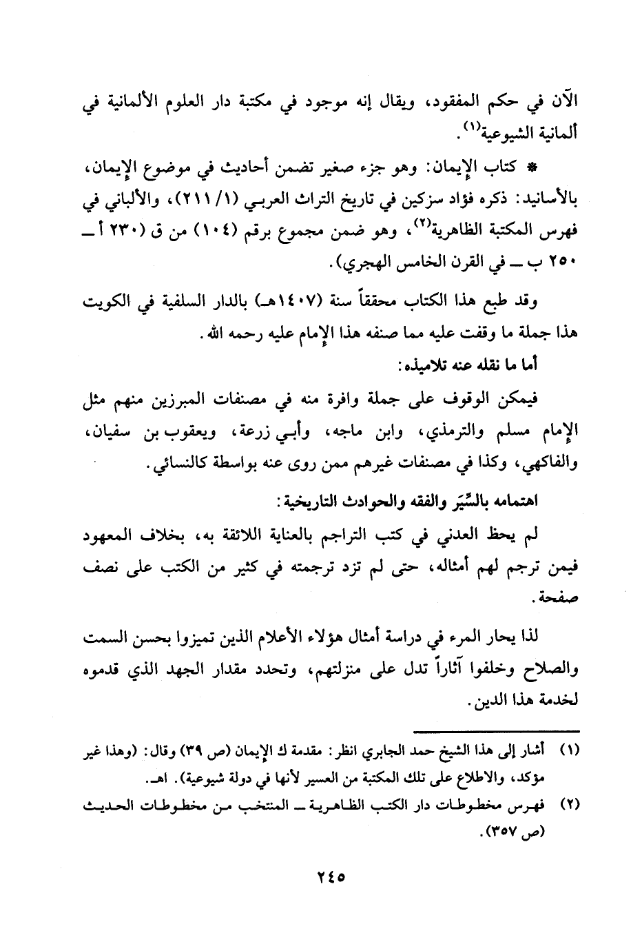 (¬1) أشار إلى هذا الشيخ حمد الجابري انظر: مقدمة ك الإيمان (ص 39) وقال: (وهذا غير مؤكد، والاطلاع على تلك المكتبة من العسير لأنها في دولة شيوعية). اهـ.