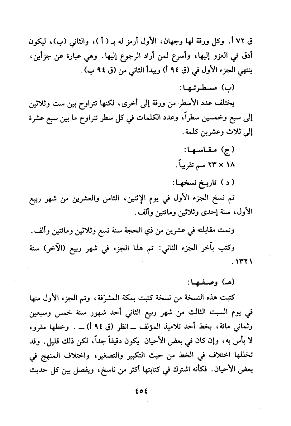 ق 72 أ. وكل ورقة لها وجهان، الأول أرمز له ب (أ)، والثاني (ب)، ليكون أدق في العزو إليها، وأسرع لمن أراد الرجوع إليها. وهي عبارة عن جزأين، ينتهي الجزء الأول في (ق 94 أ) ويبدأ الثاني من (ق 94 ب).