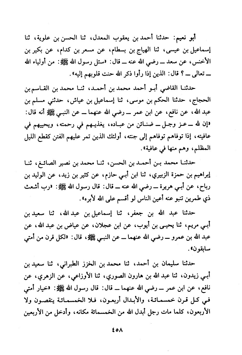 حدثنا سليمان بن أحمد، ثنا محمد بن الخزز الطبراني، ثنا سعيد بن أبي زيدون، ثنا عبد الله بن هارون الصوري، ثنا الأوزاعي، عن الزهري، عن نافع، عن ابن عمر -رضي الله عنهما- قَالَ: قَالَ رَسُولُ اللَّهِ - صَلَّى اللَّهُ عَلَيْهِ وسلم -: "خيار أمتي في كل قرن خمسمائة، والأبدال أربعون، فلا الخمسمائة ينقصون ولا الأربعون، كلما مات رجل أبدل الله من الخمسمائة مكانه، وأدخل من الأربعين