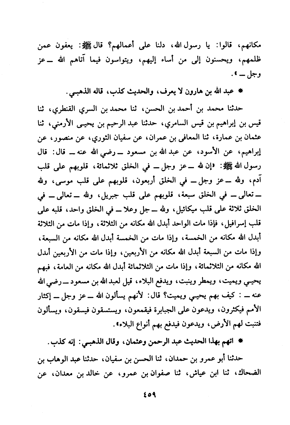 حدثنا محمد بن أحمد بن الحسن، ثنا محمد بن السري القنطري، ثنا قيس بن إبراهيم بن قيس السامري، حدثنا عبد الرحيم بن يحيى الأرمني، ثنا عثمان بن عمارة، ثنا المعافى بن عمران، عن سفيان الثوري، عن منصور، عن إبراهيم، عن الأسود، عَنْ عَبْدِ اللَّهِ بْنِ مَسْعُودٍ -رَضِيَ اللَّهُ عَنْهُ- قَالَ: قَالَ رَسُولُ اللَّهِ - صَلَّى اللَّهُ عليه وسلم -: "إن لله -عز وجل- في الخلق ثلاثمائة، قلوبهم على قلب آدم، ولله -عز وجل- في الخلق أربعون، قلوبهم على قلب موسى، ولله -تعالى- في الخلق سبعة، قلوبهم على قلب جبريل، ولله -تعالى- في الخلق ثلاثة على قلب ميكائيل، ولله -جل وعلا- في الخلق واحد، قلبه على قلب إسرافيل، فإذا مات الواحد أبدل الله مكانه من الثلاثة، وإذا مات من الثلاثة أبدل الله مكانه من الخمسة، وإذا مات من الخمسة أبدل الله مكانه من السبعة، وإذا مات من السبعة أبدل الله مكانه من الأربعين، وإذا مات من الأربعين أبدل الله مكانه من الثلاثمائة، وإذا مات من الثلاثمائة أبدل الله مكانه من العامة، فبهم يحيي ويميت، ويمطر وينبت، ويدفع البلاء، قيل لعبد الله بن مسعود -رضي الله عنه-: كيف بهم يحيي ويميت؟ قال: لأنهم يسألون الله -عز وجل- إكثار الأمم فيكثرون، ويدعون على الجبابرة فيقمعون، ويستسقون فيسقون، ويسألون فتنبت لهم الأرض، ويدعون فيدفع بهم أنواع البلاء".