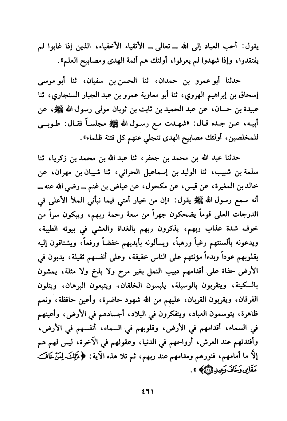 حَدَّثَنَا عَبْدُ اللَّهِ بْنُ مُحَمَّدِ بْنِ جَعْفَرٍ، ثنا عبد الله بن محمد بن زكريا، ثنا سلمة بن شبيب، ثنا الوليد بن إسماعيل الحراني، ثنا شيبان بن مهران، عن خالد بن المغيرة، عن قيس، عن مكحول، عن عياض بن غنم -رضي الله عنه- أَنَّهُ سَمِعَ رَسُولَ اللَّهِ - صَلَّى اللَّهُ عَلَيْهِ وسلم - يقول: "إن من خيار أمتي فيما نبأني الملأ الأعلى في الدرجات العلى قومًا يضحكون جهرًا من سعة رحمة ربهم، ويبكون سرًا من خوف شدة عذاب ربهم، يذكرون ربهم بالغداة والعشي في بيوته الطيبة، ويدعونه بألسنتهم رغبًا ورهبًا، ويسألونه بأيديهم خفضًا ورفعًا، ويشتاقون إليه بقلوبهم عودًا وبدءًا مؤنتهم على الناس خفيفة، وعلى أنفسهم ثقيلة، يدبون في الأرض حفاة على أقدامهم دبيب النمل بغير مرح ولا بذخ ولا مثلة، يمشون بالسكينة، ويتقربون بالوسيلة، يلبسون الخلقان، ويتبعون البرهان، ويتلون الفرقان، ويقربون القربان، عليهم من الله شهود حاضرة، وأعين حافظة، ونعم ظاهرة، يتوسمون العباد، ويتفكرون في البلاد، أجسادهم في الأرض، وأعينهم في السماء، أقدامهم في الأرض، وقلوبهم في السماء، أنفسهم في الأرض، وأفئدتهم عند العرش، أرواحهم في الدنيا، وعقولهم في الآخرة، ليس لهم هم إلَّا ما أمامهم، فنورهم ومقامهم عند ربهم، ثم تلا هذه الآية: {ذَلِكَ لِمَنْ خَافَ مَقَامِي وَخَافَ وَعِيدِ (14)} ".