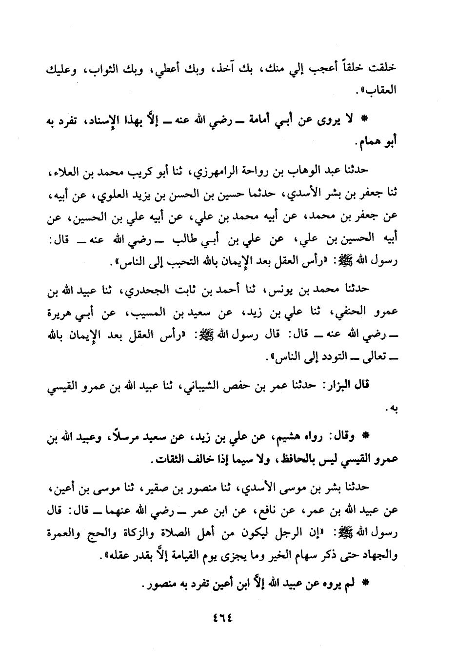 حدثنا بشر بن موسى الأسدي، ثنا منصور بن صقير، ثنا موسى بن أعين، عَنْ عُبَيْدِ اللَّهِ بْنِ عُمَرَ، عَنْ نَافِعٍ، عن ابن عمر -رضي الله عنهما- قَالَ: قَالَ رَسُولُ اللَّهِ - صَلَّى اللَّهُ عَلَيْهِ وسلم -: "إن الرجل ليكون من أهل الصلاة والزكاة والحج والعمرة والجهاد حتى ذكر سهام الخير وما يجزى يوم القيامة إلَّا بقدر عقله".