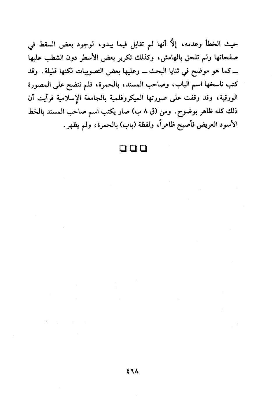 حيث الخطأ وعدمه، إلَّا أنها لم تقابل فيما يبدو، لوجود بعض السقط في صفحاتها ولم تلحق بالهامش، وكذلك تكرير بعض الأسطر دون الشطب عليها -كما هو موضح في ثنايا البحث- وعليها بعض التصويبات لكنها قليلة. وقد كتب ناسخها اسم الباب، وصاحب المسند، بالحمرة، فلم تتضح على المصورة الورقية، وقد وقفت على صورتها الميكروفلمية بالجامعة الإسلامية فرأيت أن ذلك كله ظاهر بوضوح. ومن (ق 8 ب) صار يكتب اسم صاحب المسند بالخط الأسود العريض فأصبح ظاهرًا، ولفظة (باب) بالحمرة، ولم يظهر.