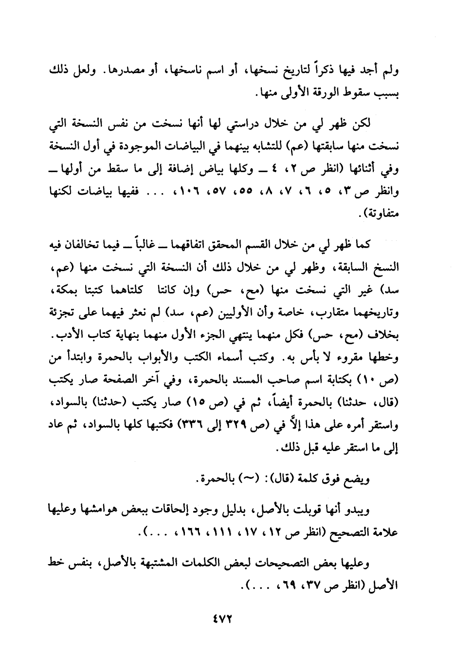 لكن ظهر لي من خلال دراستي لها أنها نسخت من نفس النسخة التي نسخت منها سابقتها (عم) للتشابه بينهما في البياضات الموجودة في أول النسخة وفي أثنائها (انظر ص 2، 4 - وكلها بياض إضافة إلى ما سقط من أولها- وانظرص 3، 5، 6، 7، 8، 55، 57، 106، ... ففيها بياضات لكنها متفاوتة).