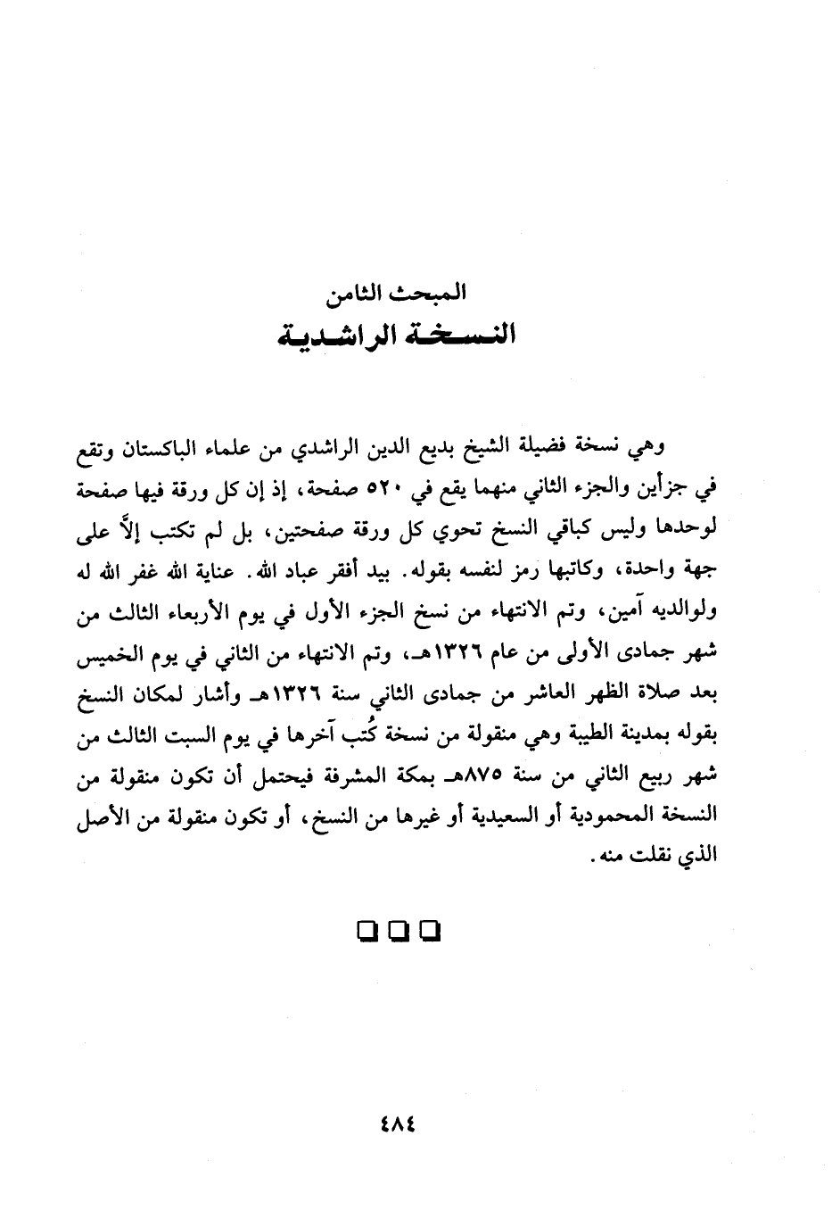 وهي نسخة فضيلة الشيخ بديع الدين الراشدي من علماء الباكستان وتقع في جزأين والجزء الثاني منهما يقع في 520 صفحة، إذ إن كل ورقة فيها صفحة لوحدها وليس كباقي النسخ تحوي كل ورقة صفحتين، بل لم تكتب إلَّا على جهة واحدة، وكاتبها رمز لنفسه بقوله. بيد أفقر عباد الله. عناية الله غفر الله له ولوالديه آمين، وتم الانتهاء من نسخ الجزء الأول في يوم الأربعاء الثالث من شهر جمادى الأولى من عام 1326 هـ، وتم الانتهاء من الثاني في يوم الخميس بعد صلاة الظهر العاشر من جمادى الثاني سنة 1326 هـ وأشار لمكان النسخ بقوله بمدينة الطيبة وهي منقولة من نسخة كُتب آخرها في يوم السبت الثالث من شهر ربيع الثاني من سنة 875هـ بمكة المشرفة فيحتمل أن تكون منقولة من النسخة المحمودية أو السعيدية أو غيرها من النسخ، أو تكون منقولة من الأصل الذي نقلت منه.