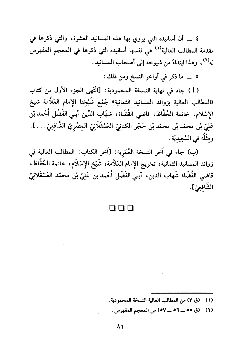 (أ) جاء في نهاية النسخة المحمودية: [انْتَهى الجزء الأول من كتاب "المطالب العالية بزوائد المسانيد الثمانية" جَمْع شَيْخِنا الإمام العَلامة شيخ الإسْلام، خاتمة الحُفاظ، قاضي القُضَاة، شهَاب الدين أبي الفَضل أحْمد بْن عَلِي بن محمد بْن محمد بْن حَجَر الكنانِيّ العَسْقَلاَنِي المِصْرِي الشَّافِعِي ...].