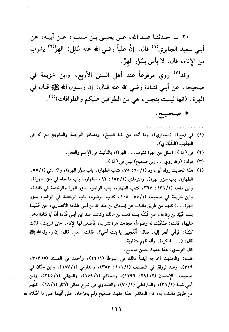 وَقَدْ رُوِيَ مَرْفُوعًا عِنْدَ أَهْلِ السُّنَنِ الْأَرْبَعِ، وَابْنِ خُزَيْمَةَ فِي صَحِيحِهِ، عَنْ أَبِي قَتَادَةَ رَضِيَ اللَّهُ عَنْهُ قَالَ: إِنَّ رَسُولَ اللَّهِ صَلَّى اللَّهُ عَلَيْهِ وَسَلَّمَ قَالَ فِي الْهِرَّةِ: (إِنَّهَا لَيْسَتْ بِنَجَسٍ، هِيَ مِنَ الطَّوَّافِينَ عَلَيْكُمْ وَالطَّوَّافَاتِ)